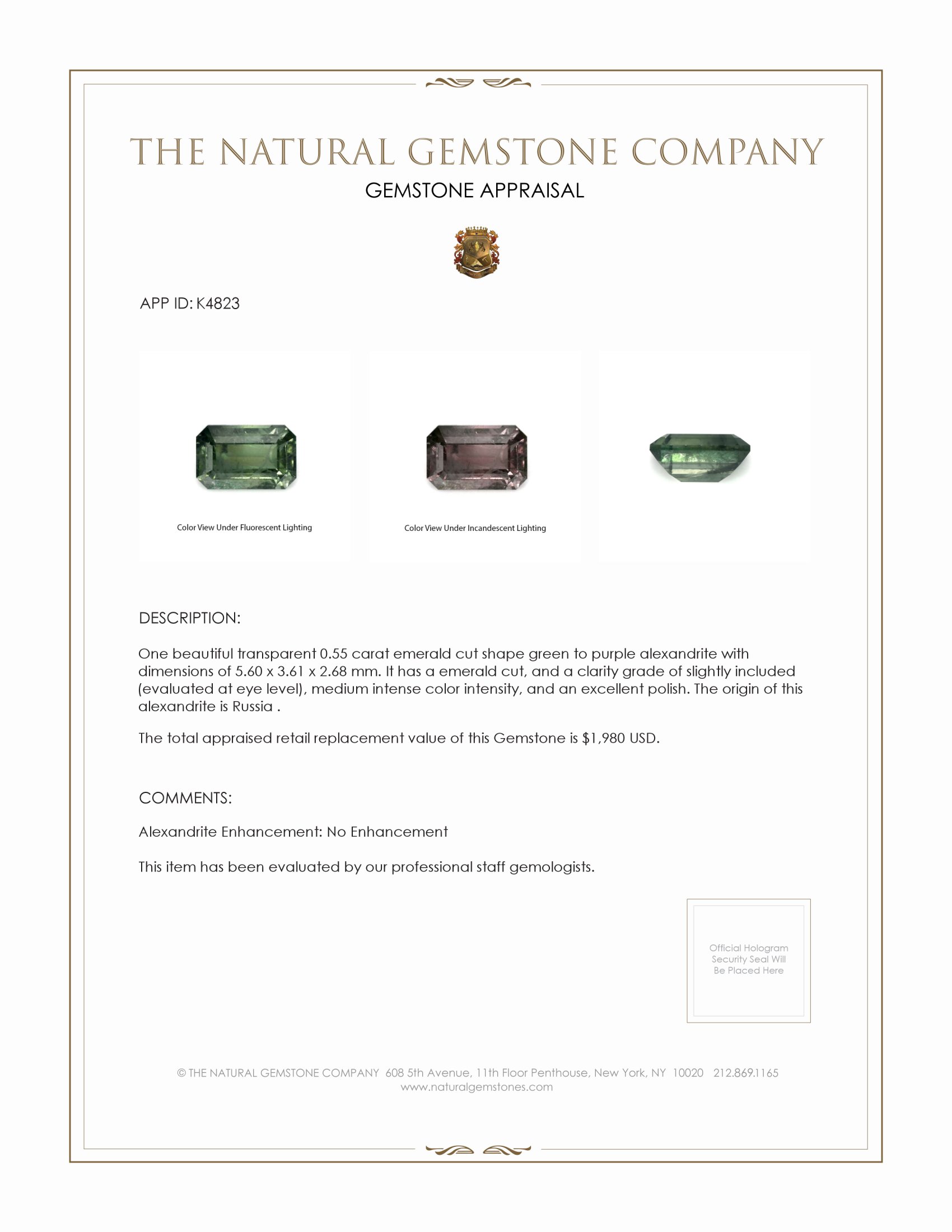 Whether you're searching for the perfect engagement ring or a statement piece for a special occasion, the 0.55 carat emerald cut alexandrite will exceed your expectations. Its ability to shift colors elegantly captures the spirit of timeless beauty and versatile style. Imagine owning a gemstone that not only embraces the majestic allure of its colors but also accentuates your style with unmatched sophistication. Such a gem redefines how you perceive luxury, elevating every ensemble to a new level of refinement.