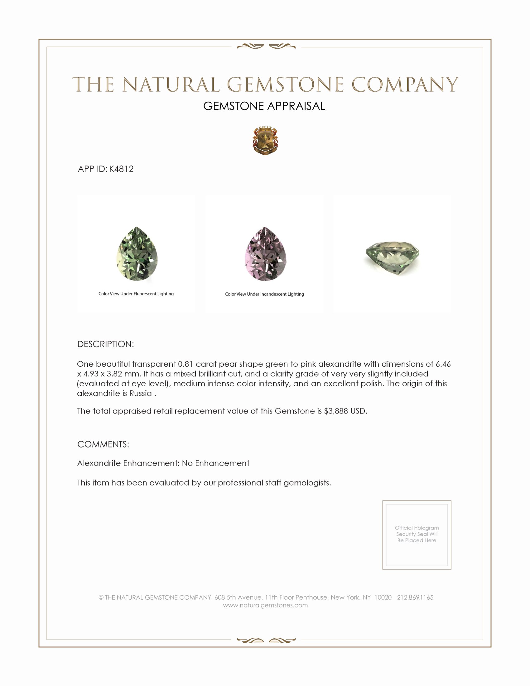 As miners gently pry this jewel from the earth, nestled within its raw matrix, they do so with a reverence learned from generations past. Russia's legacy as a haven for captivating gems ensures that every step in the extraction process is governed by a principle of respect not only for the gem but for the land itself. Once liberated from its earthly confines, our 0.81 carat pear-shaped alexandrite finds its way from the depths of nature to the skilled hands of master gem cutters. Their artistry is guided by a vision not merely to refine, but to reveal the inner radiance of what has already been perfectly conceived by nature.