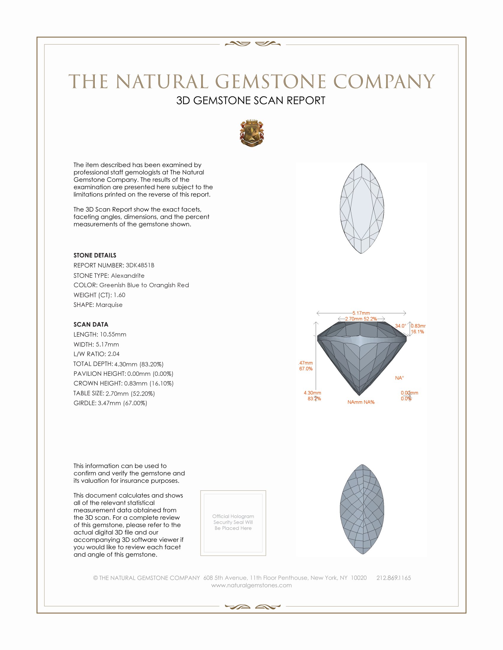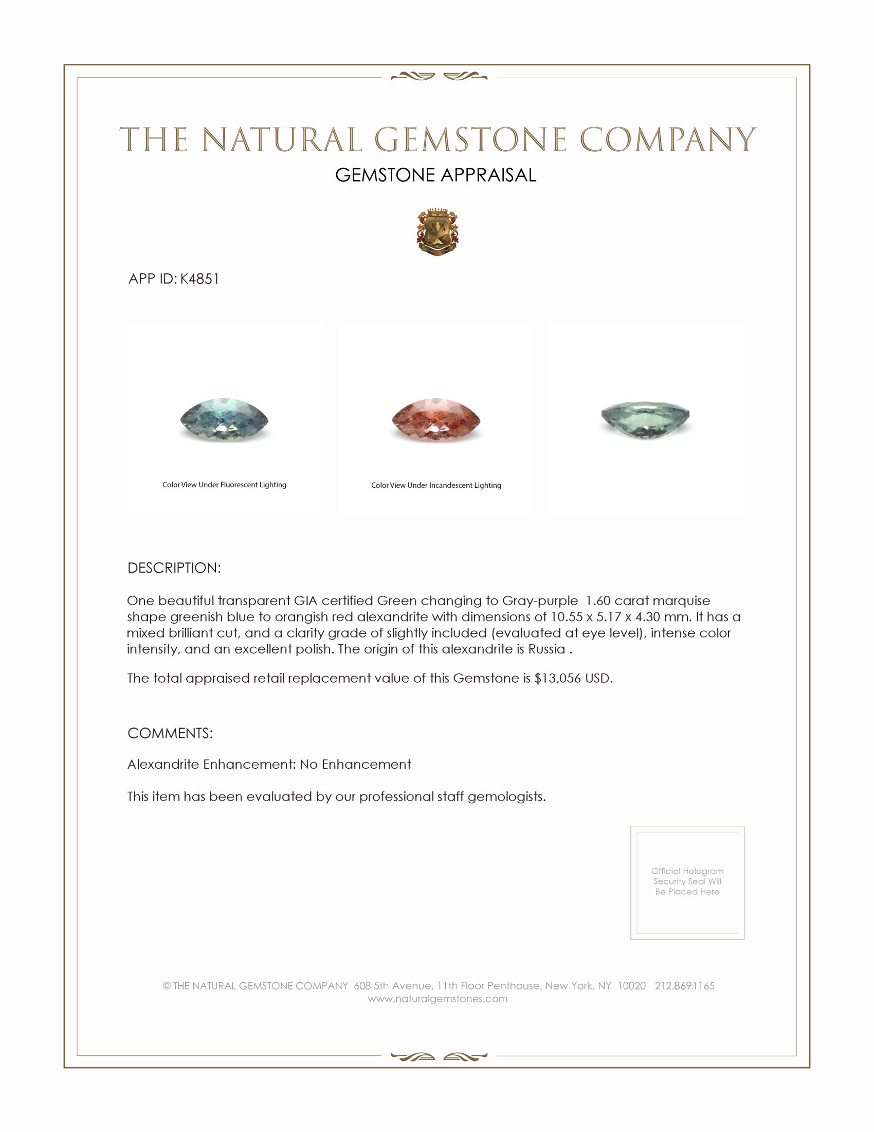 Crafted into a magnificent marquise shape, the alexandrite’s dimensions, measuring 10.55 x 5.17 x 4.30 mm, allow it to boast a balanced surface that gracefully captures light. Its mixed brilliant cut ensures that brilliance is reflected throughout the stone, contributing to an intense and vibrant color display. Its spectacular hues transition from a captivating greenish-blue under natural daylight to an enchanting orangish-red under incandescent lighting. The excellent polish on this stone enhances its luminous quality, enabling it to emit an exquisite shimmer. Although slightly included when evaluated, this does not detract from its charm, but rather accentuates its natural authenticity. This gemstone has experienced no enhancement, allowing you to appreciate its raw, natural beauty that has been maintained through skillful crafting and meticulous care.
