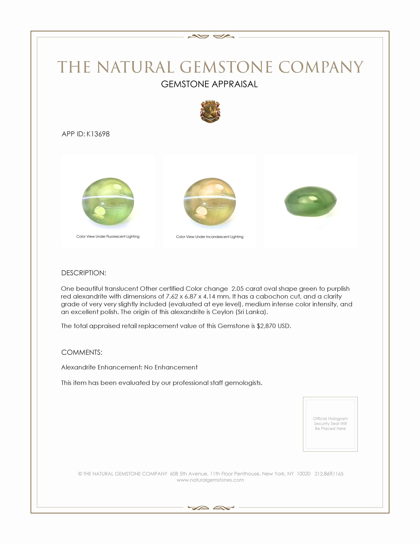 Experience the captivating allure of a rare gem that embodies both mystery and magnificence. Presenting our exquisite creation: a 2.05 carat oval-shaped alexandrite, a treasure brought to you by The Natural Gemstone Company. This unique gemstone unravels its secrets through an enchanting color transformation, elegantly transitioning from green to a mesmerizing purplish-red. Rendered in the timeless sophistication of a cabochon cut, this alexandrite offers a glimpse into the ethereal beauty of earth’s finest manifestations. The medium intense color intensity bursts forth with a vibrancy that is at once enchanting and imposing, a testament to the hidden wonders beneath the earth's crust.