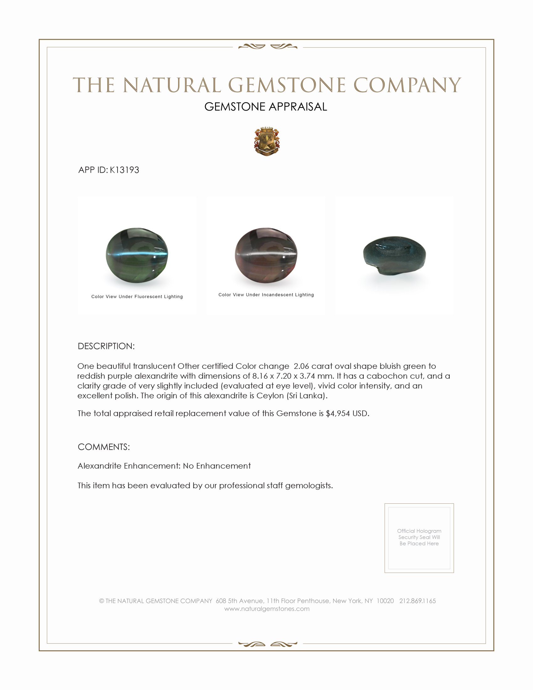 Indulge in the allure of rarity with this extraordinary 2.06-carat alexandrite, a true gem of distinction presented by The Natural Gemstone Company. This captivating oval-shaped stone, with dimensions of 8.16 x 7.20 x 3.74 mm, is designed for those who seek the unique and the unparalleled. Alexandrite is celebrated not only for its remarkable color change but also for its scarcity, making it a prized possession in the luxury gemstone market. Unlike more common gemstones like sapphires or rubies, this alexandrite's distinct bluish-green to reddish-purple hues make it stand out, creating a visual spectacle that captivates the heart.