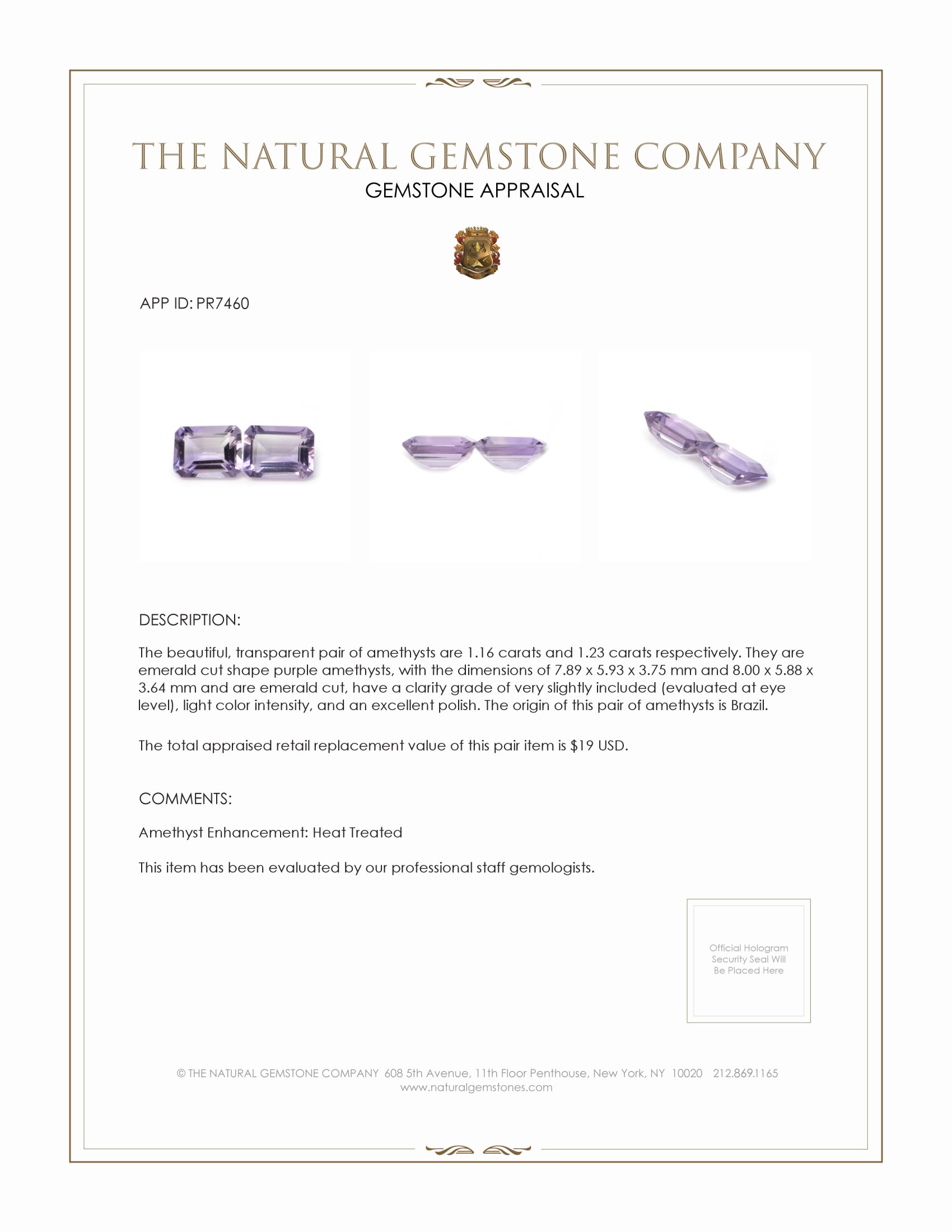 Elevate your jewelry collection with this exquisite pair of amethysts that radiate elegance and charm. Each gemstone in this beautiful, transparent pair exudes a unique brilliance that captures light in a mesmerizing way. With a combined weight of 2.39 carats, these amethysts are designed to impress, adding a touch of luxury to any setting. Their perfect emerald cut gives them a sophisticated, timeless appeal, making them an ideal choice for those who appreciate classic beauty with a modern touch.