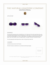 This exquisite pair of amethysts showcases a stunning display of elegance and craftsmanship. Weighing at 2.47 carats and 2.20 carats respectively, these oval-shaped gemstones exude a captivating purple hue. With precise dimensions measuring 10.08 x 8.02 x 5.12 mm and 10.07 x 8.08 x 5.68 mm, they are meticulously cut in a mixed brilliant style to maximize their inherent brilliance. These amethysts possess a clarity grade of very slightly included, meticulously evaluated at eye level to ensure quality. Their vivid color intensity enhances the visual impact, while the excellent polish reflects a commitment to precision and care.