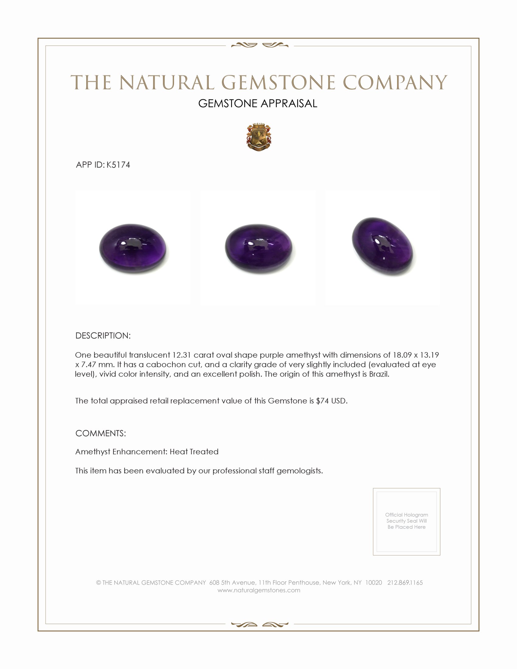 Steeped in ancient lore and celebrated throughout history, the amethyst holds a unique position as one of the most revered gemstones of all time. Known for its rich, bold hues, amethyst has adorned the crown jewels of empires and whispered secrets from the throats of ancient diviners. The highly translucent 12.31-carat purple amethyst offered by The Natural Gemstone Company stands as a testament to this legacy, a timeless treasure piece that draws from the heart of Brazil. With dimensions of 18.09 x 13.19 x 7.47 mm, its generous oval shape and cabochon cut are not mere aesthetic choices but a nod to the gem’s rich historic significance. The cabochon cut, which highlights the amethyst’s translucent quality and vivid color intensity, evokes a sense of continuity and veneration for the classical design elements cherished by those who value tradition and heritage.
