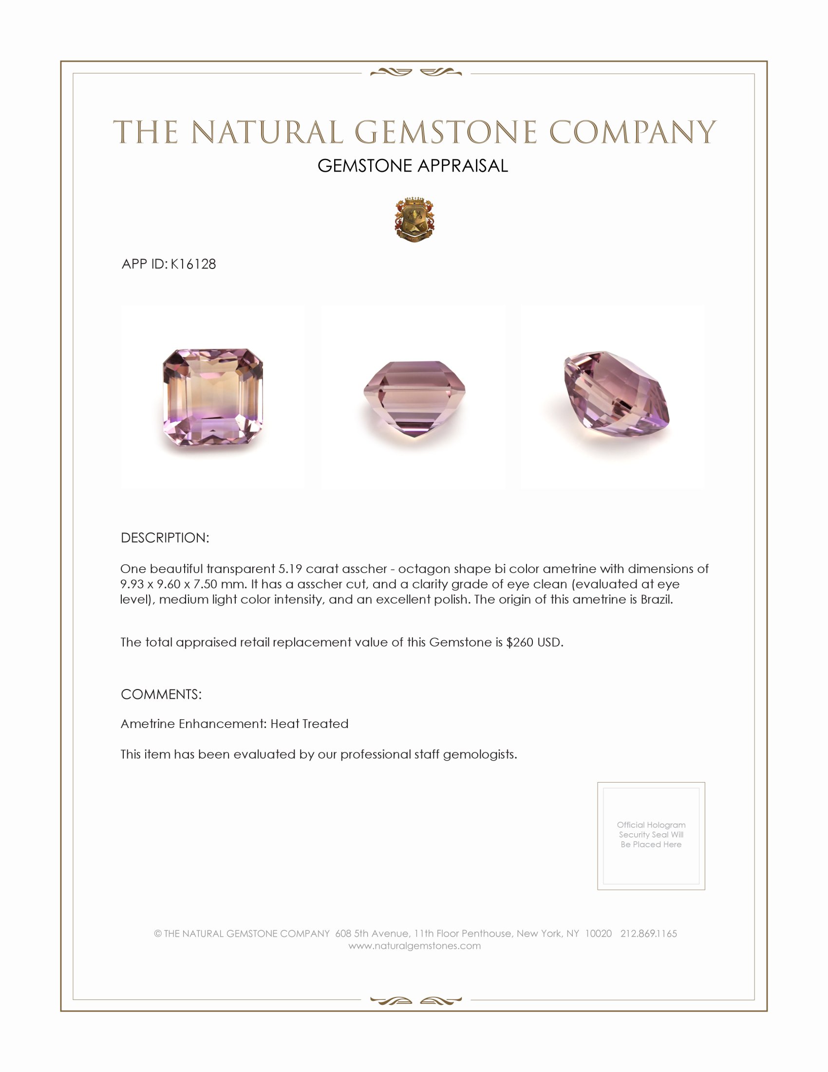Introducing an exquisite masterpiece from The Natural Gemstone Company. This remarkable 5.19 carat bi-color ametrine is not just a gemstone, it is an experience of rare luxury and unparalleled beauty. Its transparent nature and distinct asscher-octagon shape are accentuated by unparalleled craftsmanship, making it a piece coveted by collectors and connoisseurs alike. Featuring dimensions of 9.93 x 9.60 x 7.50 mm, this ametrine captures an enchanting duality of colors, seamlessly blending the soothing hues of amethyst and citrine. This effect is amplified by the Asscher cut that enhances its brilliance and fire. Acclaimed for its eye-clean clarity, the medium light color intensity, and excellent polish, this gemstone from the depths of Brazil stands as a testament to artistry and nature’s timeless elegance.