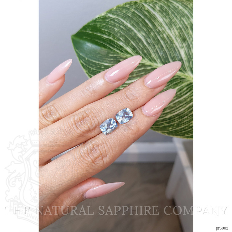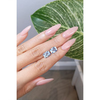 Each aquamarine is distinguished by its own unique size, contributing to their appeal as a one-of-a-kind match. The first stone weighs 1.70 carats, while its partner shines at 2.06 carats, both cut into elegant cushion shapes. Their dimensions, measuring 8.89 x 6.97 x 4.26 mm and 9.00 x 7.03 x 4.98 mm respectively, emphasize their substantial presence. The mixed brilliant cut further enhances their ability to refract light, delivering an arresting display of sparkle. The stones possess a clarity grade of very slightly included, showcasing minimal inclusions that are invisible to the unaided eye—amplifying the aquamarines’ luminescence and enhancing their visual perfection.