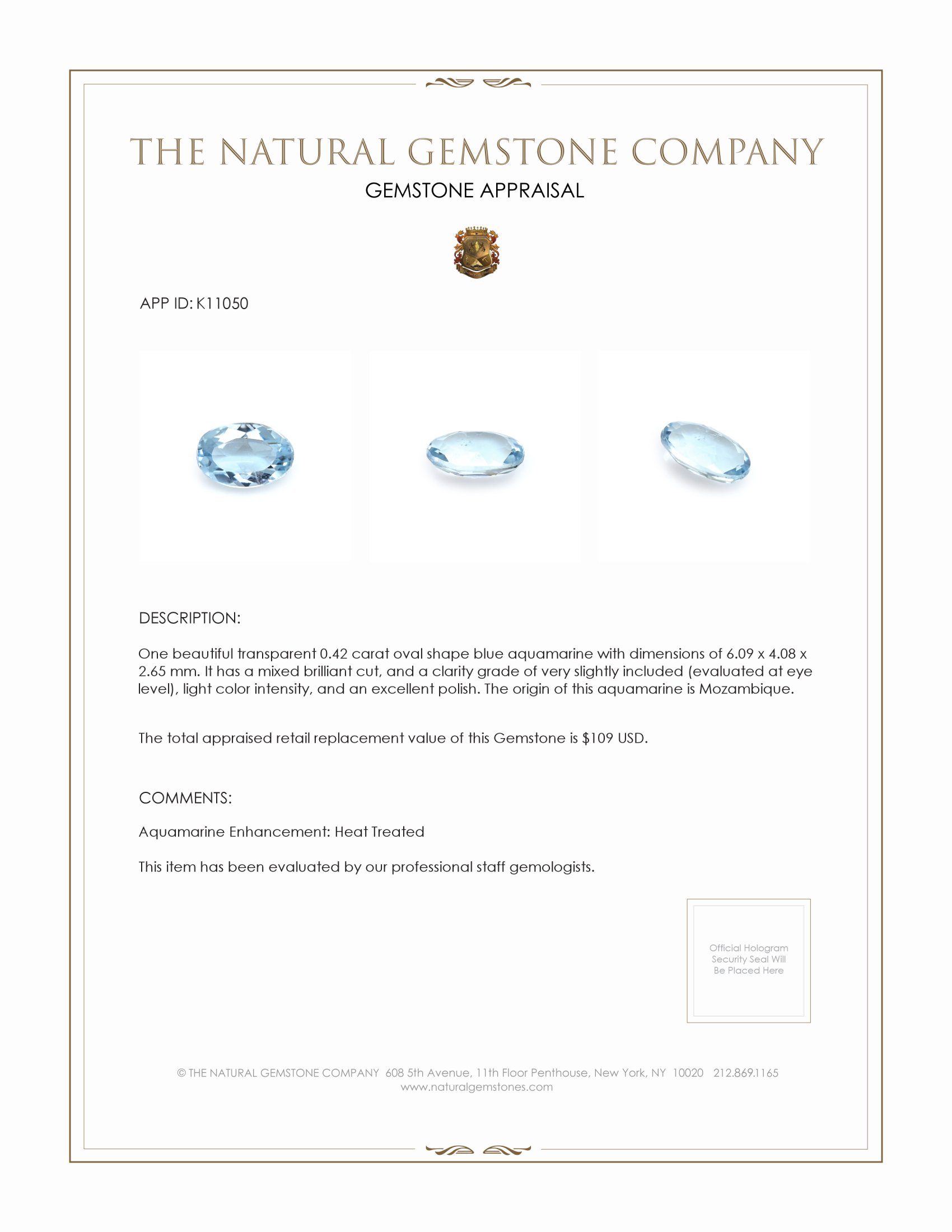 In the heart of Mozambique, where the land meets the sky, embraced by the warmth of the African sun, lies a world of hidden treasures deep beneath the earth's surface. It is here, amidst the whispers of ancient winds, that our journey begins—a journey remarkable enough to grace only the most discerning connoisseurs. Embedded in the allure of Mozambique’s rugged terrain, a rare gem awaited its moment—an exquisite 0.42-carat blue aquamarine, destined for those who understand the true meaning of exclusivity. This transparent marvel, shaped with meticulous care into an elegant oval, bears the soul-stirring dimensions of 6.09 x 4.08 x 2.65 mm. Its mixed brilliant cut reflects a radiance that is bound to enchant the bearer, a testament to the skill of the artisans who brought it to life, under the expert gaze of The Natural Gemstone Company.