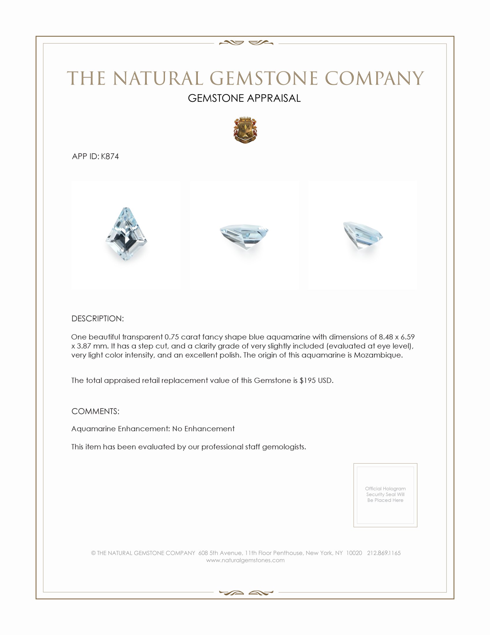 Introducing an exquisite addition to any high-end gemstone collection, we present a mesmerizing 0.75 carat fancy shape blue aquamarine, offered exclusively by The Natural Gemstone Company. This exceptional gemstone is notable not only for its captivating hue but also for its precise craftsmanship, manifesting truly remarkable attributes that distinguish it as a premier specimen for discerning collectors. With dimensions of 8.48 x 6.59 x 3.87 mm, this aquamarine has been meticulously crafted into a step cut, a choice that enhances its inherent luminosity and elegance. The step cut, known for its parallel facets that resemble steps, maximizes the gem’s scintillation, offering a mesmerizing play of light that adds depth to the viewing experience.