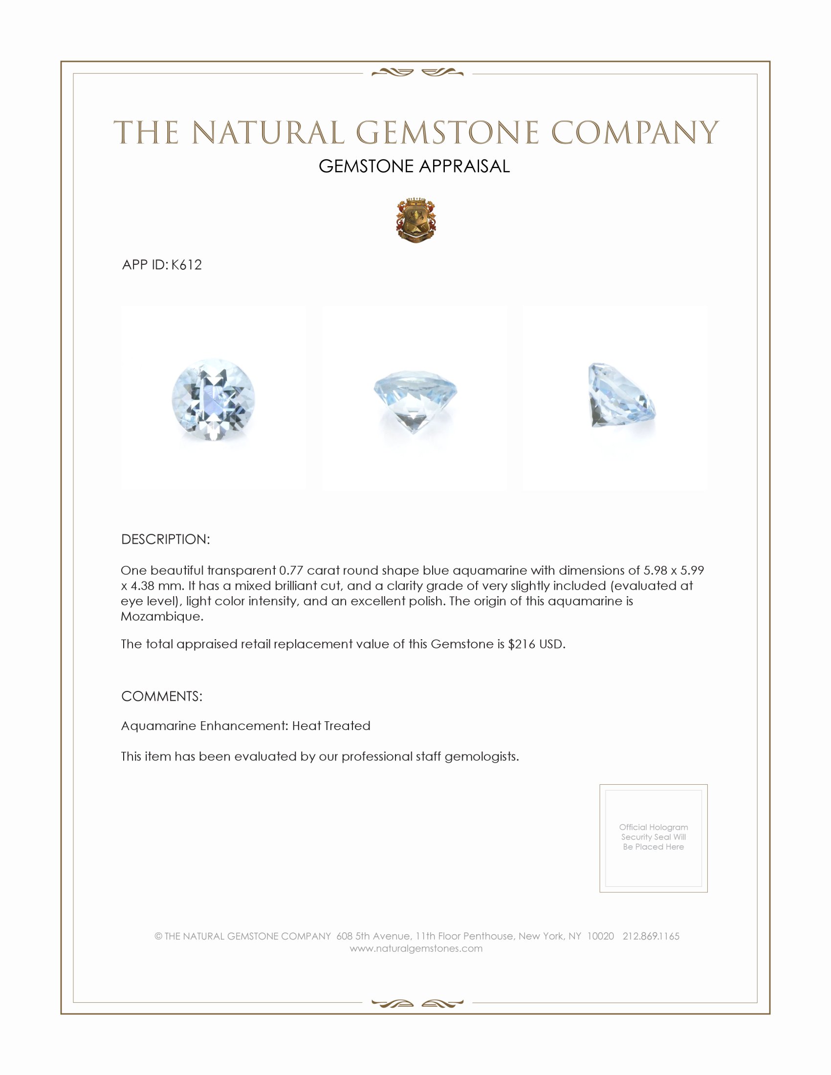 When it comes to selecting gemstones, discerning buyers often seek the unique allure and intrinsic value that speaks to both quality and rarity. This is precisely why the aquamarine from Mozambique captivates collectors and jewelry enthusiasts alike. Nestled within the rich geological heritage of Mozambique, this exquisite transparent 0.77 carat round aquamarine embodies a combination of natural beauty and superior craftsmanship unlike any other. Its dimensions, measuring 5.98 by 5.99 by 4.38 mm, not only highlight its ideal proportions but also contribute to its exceptional brilliance.