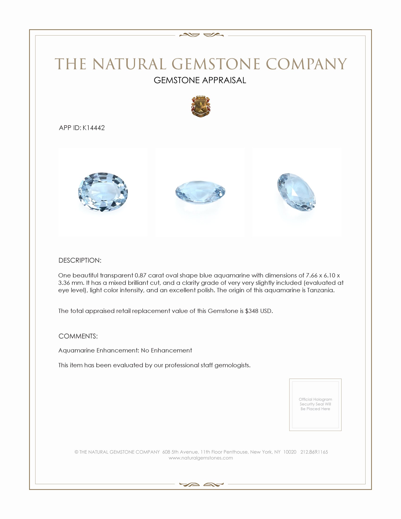 Amidst the swirling mists of legend and lore, where the whispers of ancient oceans cradle the dreams of time itself, emerges a treasure of rare tranquility. This exquisite 0.87-carat blue aquamarine, offered by The Natural Gemstone Company, embodies the celestial allure of a dawning sky glistening at the edge of night. With its delicate dimensions of 7.66 x 6.10 x 3.36 mm, it holds within its heart the mysteries of the eternal sea, a charming reflection of nature’s most serene expressions.