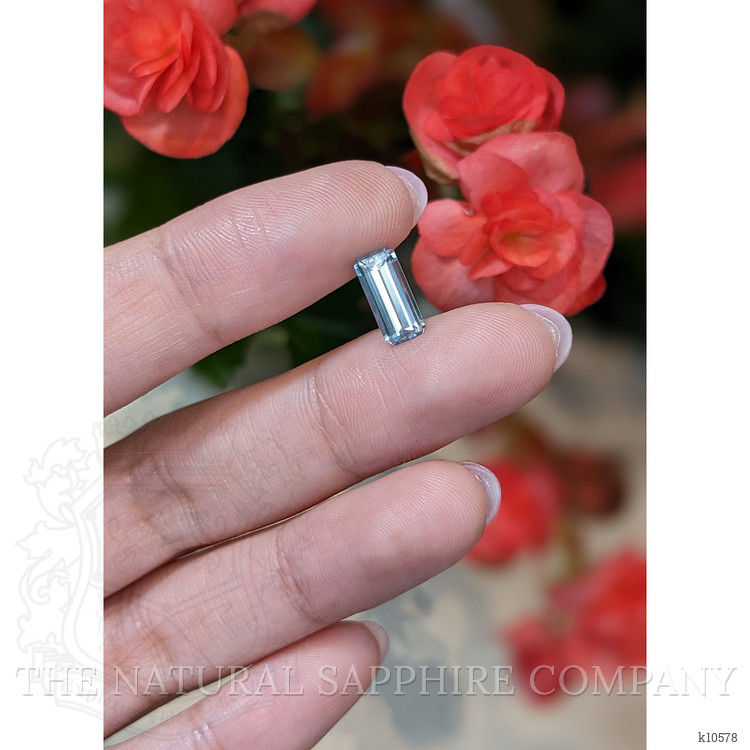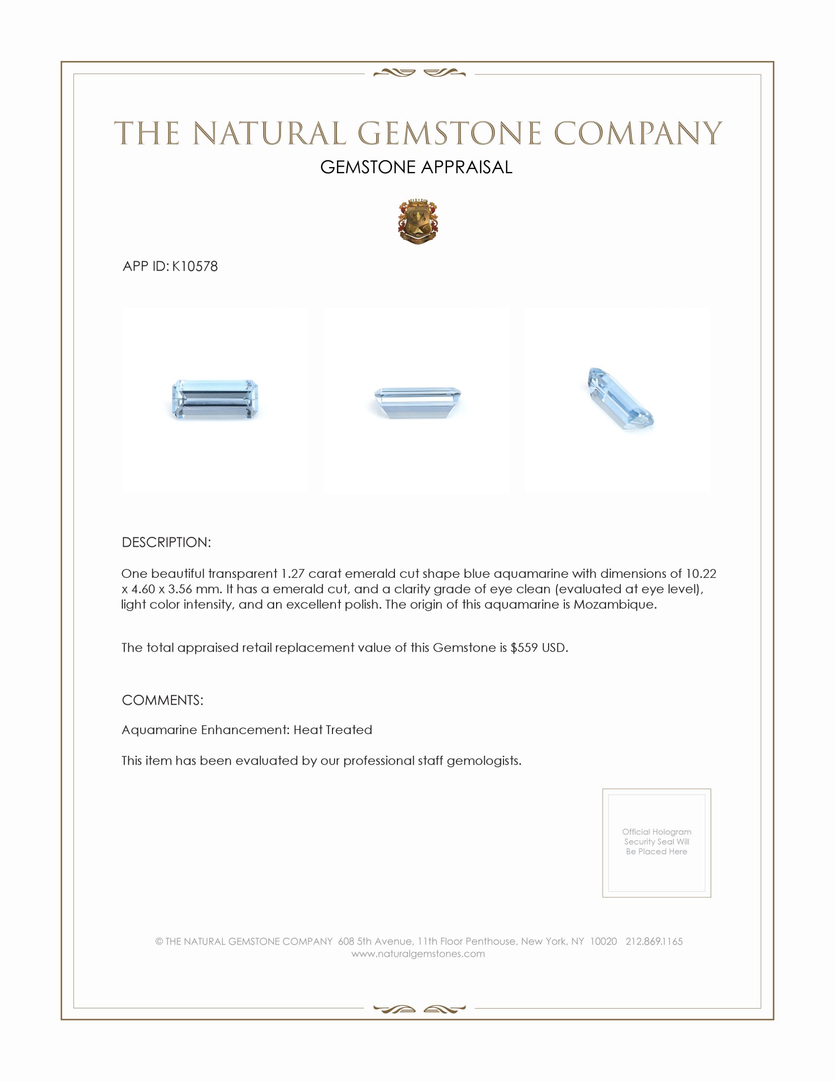 Introducing a stunning masterpiece from The Natural Gemstone Company, this exquisite blue aquamarine is a testament to the art of fine gemstone craftsmanship. Featuring a transparent 1.27 carat gem, this aquamarine is meticulously cut into an emerald shape, measuring 10.22 x 4.60 x 3.56 mm. The precision involved in crafting this emerald cut is evident, as it requires skilled artisanship to bevel the long rectangular facets that maximize the gem's inherent brilliance while maintaining its robust structure. This specific cut enhances the gem's ability to reflect light with so much grace that it creates an entrancing play of azure hues, captivating from every angle.
