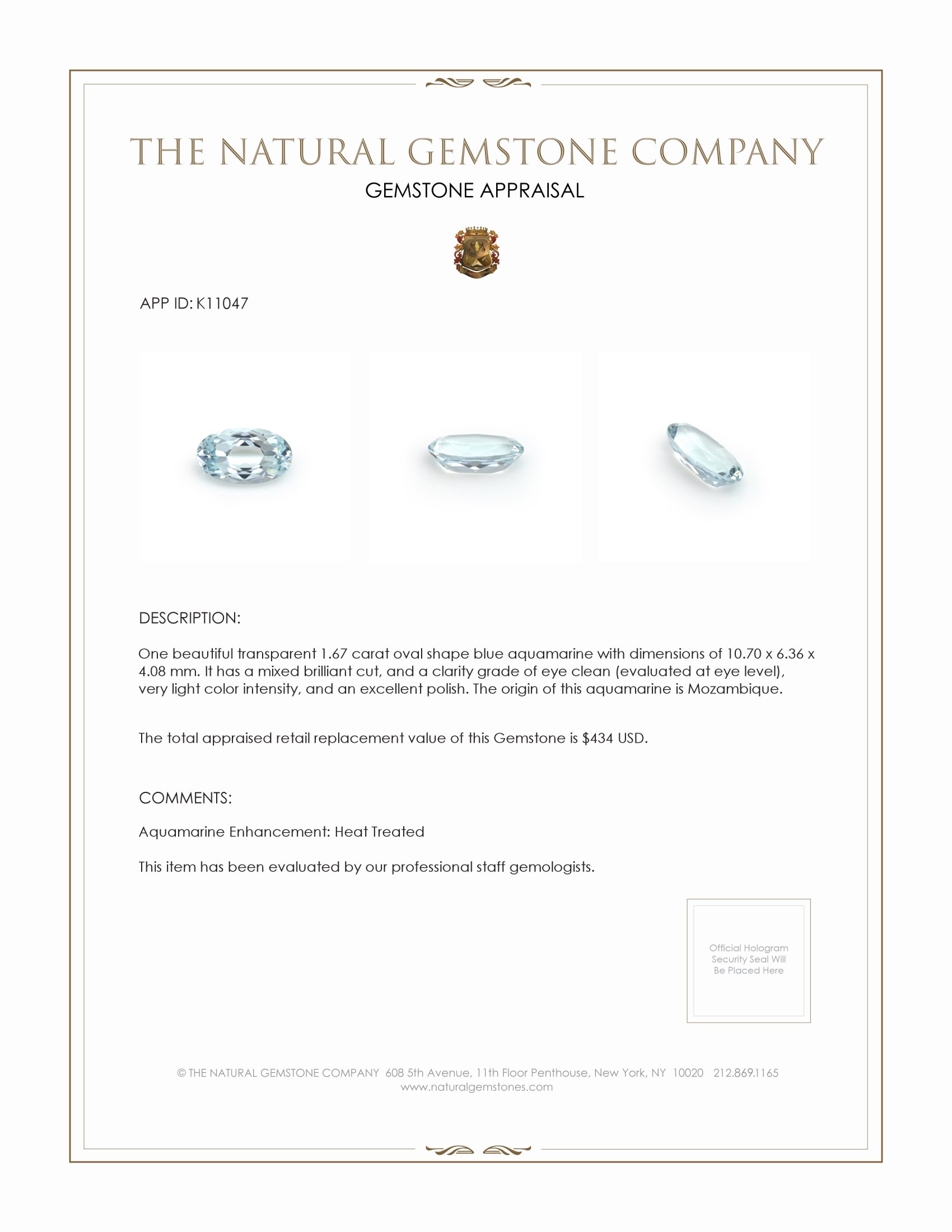 In the dazzling world of gemstones, where each precious stone tells its own unique story, finding one that stands out from the rest can be quite the treasure. The Natural Gemstone Company is thrilled to introduce an extraordinary find—a stunning 1.67-carat oval-shaped blue aquamarine. With precise dimensions of 10.70 x 6.36 x 4.08 mm, this gem is not just another addition to our collection. It is an exceptional piece that surpasses many others in the market today. Originating from the famed mines of Mozambique, it speaks volumes of authenticity and rarity. This aquamarine captures attention with its transparency and is alluring on every level. Unlike many other gemstones which may appear cloudy or contain visible impurities, this particular aquamarine features a remarkable clarity grade of eye clean, evaluated meticulously at eye level.