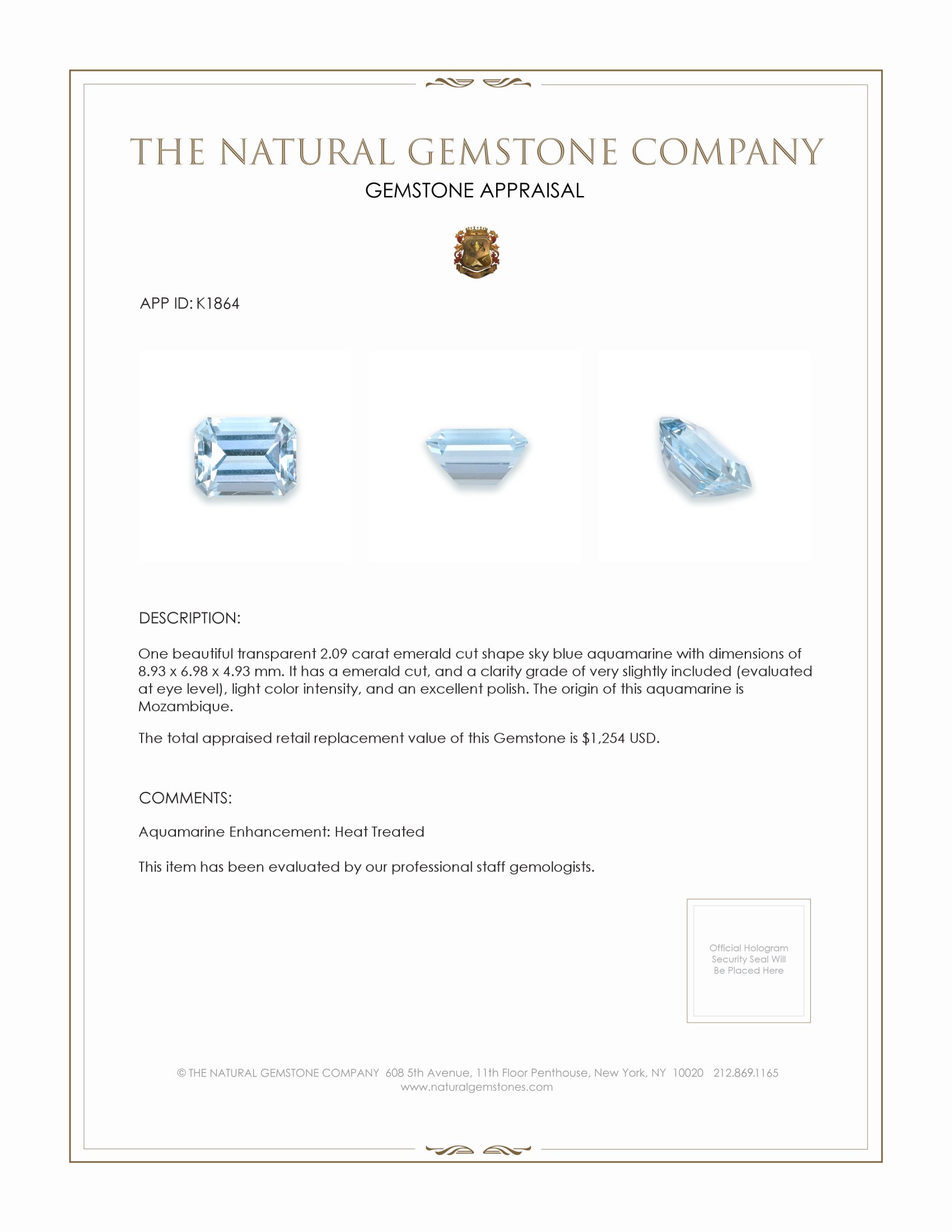The provenance of a gemstone can significantly contribute to its appeal and historical significance. The origin of this aquamarine from Mozambique further enhances its desirability, as the region is renowned for producing stones with exceptional clarity and color. The Natural Gemstone Company sources natural stones with a commitment to preserving and promoting their unique geographical backgrounds. This dedication ensures that our clients receive only the gemstones that exhibit the finest quality. The excellent polish of this aquamarine affords it an unmatched brilliance. Each facet of the stone is precisely cut, maximizing its visual appeal.