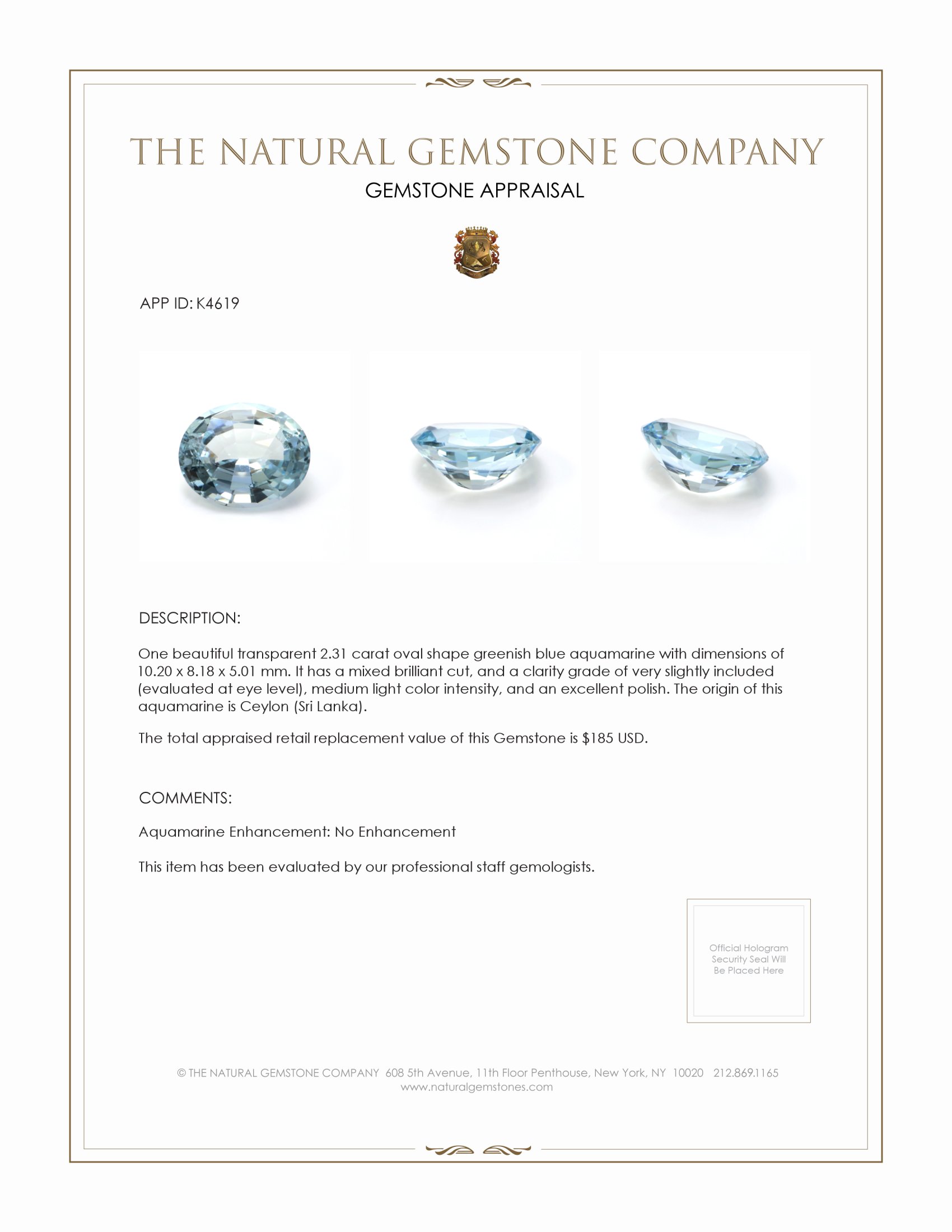 In conclusion, the 2.31-carat greenish-blue aquamarine from The Natural Gemstone Company is more than just a gemstone; it is an embodiment of natural beauty and skilled artistry. Its ideal size and shape open a world of possibilities for custom jewelry creation. With clarity, polish, and origin all contributing to its exceptional value, this gemstone stands as a wise investment for those seeking to own a truly distinguished piece. Purchasers are assured of a product that not only meets but exceeds expectations, combining both beauty and elegance in equal measure. Whether set in a ring, necklace, or another personal creation, this aquamarine promises to add a touch of sophistication and splendor to any jewelry collection.