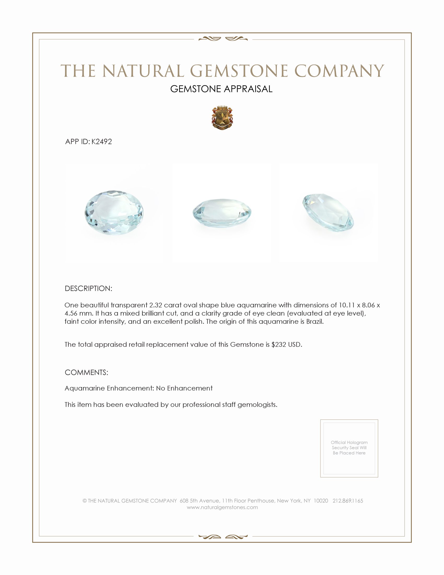 In the realm of exquisite gemstones where only the finest creations capture the discerning eye of true connoisseurs, the allure of our magnificent blue aquamarine stands unparalleled. Presented by The Natural Gemstone Company, this resplendent gem, capturing crystalline allure and serene hues, is more than just an object of beauty—it is a treasure born of both nature and artistry, a testament to your elevated taste and refined status. Measuring an elegant 10.11 by 8.06 by 4.56 millimeters and weighing a sumptuous 2.32 carats, this stone is crafted in an enduring oval shape that captures light with a dance across its surface, courtesy of a mixed brilliant cut revealing its heart in radiant flashes that are sure to captivate all who behold it.