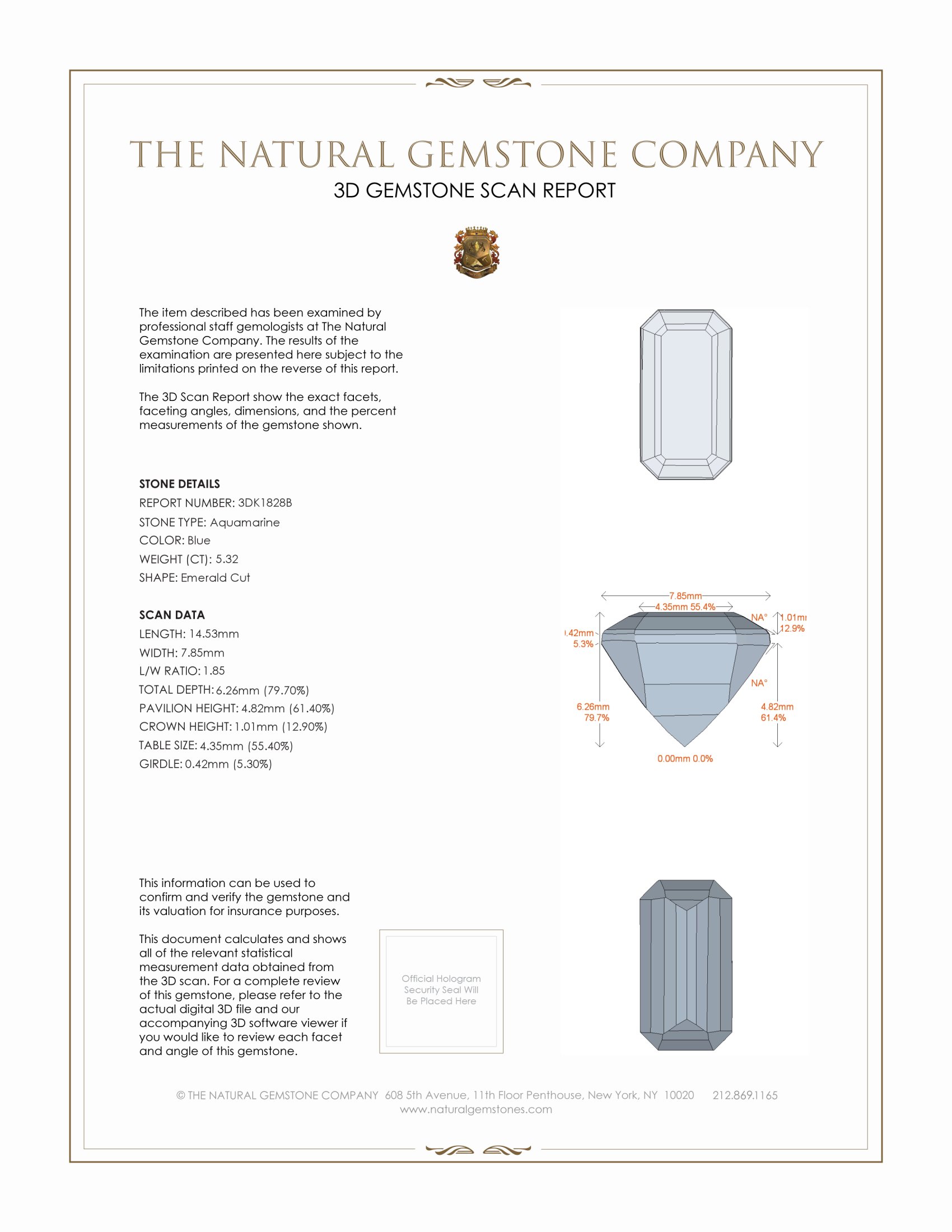 The Natural Gemstone Company proudly presents a stunning 5.32 carat blue aquamarine, a masterpiece that exemplifies the precision and expertise of skilled craftsmanship. This aquamarine sports an elegant emerald cut, a choice made to enhance the inherent beauty of the gemstone, bringing forth both its clarity and color. With dimensions of 14.53 x 7.85 x 6.26 mm, the stone's facets are expertly aligned to maximize its brilliance, ensuring that it captures and reflects light in the most captivating manner imaginable. The exquisite faceting style of the emerald cut is particularly important as it allows the gem's pristine qualities to be showcased effortlessly, creating a timeless piece that attracts knowledgeable buyers with an eye for detail.