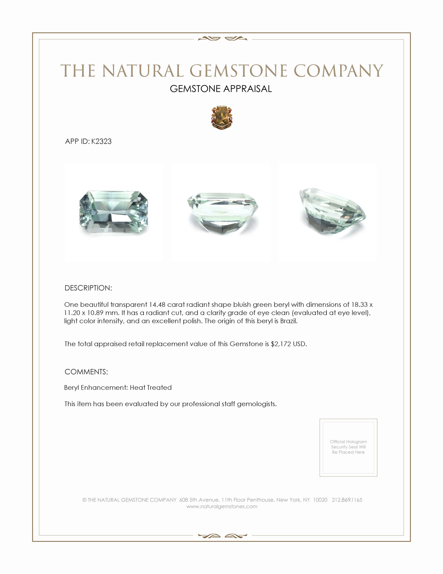 Throughout the annals of history, gemstones have captured the imagination and admiration of civilizations across the globe. Among these prized jewels, the green beryl stands as a testament to both nature's artistry and the enduring allure of gemstones. At The Natural Gemstone Company, we are proud to present a magnificent 14.48 carat radiant green beryl that not only exemplifies exceptional beauty and craftsmanship but also echoes the legacy of its storied ancestors.