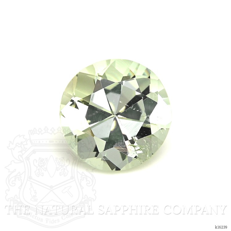 This transparent 2.01 carat round yellowish green beryl offered by The Natural Gemstone Company is presented with precise metrology and gemological quality, dimensions 8.60 by 8.50 by 5.76 millimeters, average diameter approximately 8.55 millimeters, and a pavilion depth resulting in an overall depth of approximately 67 percent. The stone is fashioned with a mixed brilliant cut, incorporating a brilliant style crown paired with modified pavilion facetting to balance scintillation and color return, and the excellent polish ensures crisp facet junctions and strong light return. Clarity is reported as very very slightly included evaluated at eye level, indicating an essentially eye clean appearance with only minor pinpoint or linear inclusions visible under scrutiny, and the light color intensity shows a delicate yellowish green tone that reads as fresh and versatile in multiple lighting environments. No enhancement has been applied, the origin is unknown, and the gem presents with the typical beryl material properties including a refractive index in the range expected for beryl and modest birefringence, which together yield clean light transmission and subtle internal play without the doubled facet images associated with higher birefringence gems.