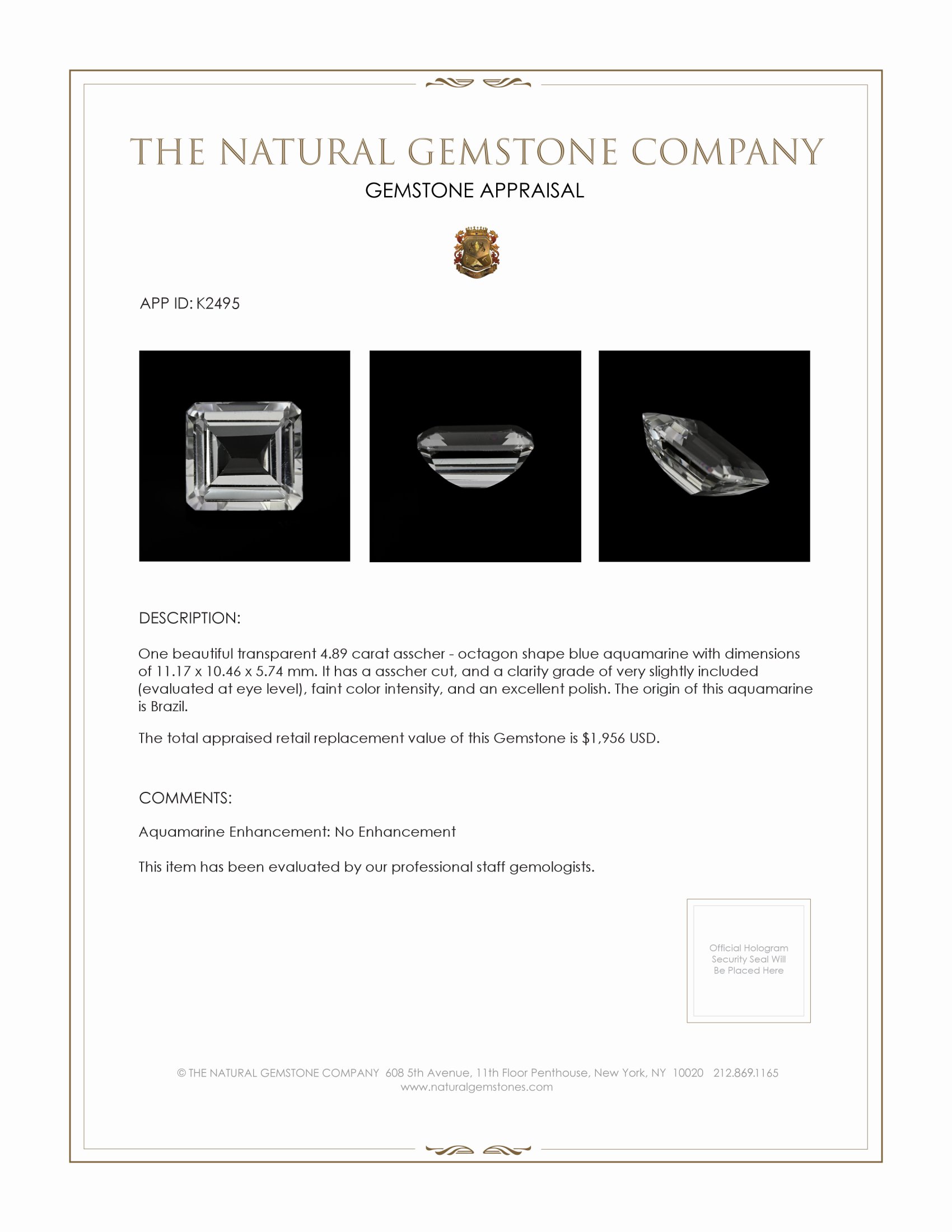In conclusion, the 4.89 carat asscher cut white beryl offered by The Natural Gemstone Company stands as a paragon of beauty and craftsmanship in the gem world. Its unique size and shape make it ideal for custom jewelry, while its flawless clarity, colorless intensity, exceptional polish, and distinguished origin provide significant advantages over other market options. By choosing this gemstone for a custom piece, customers are not only investing in an elegant and versatile component but are also making an informed choice in favor of superior quality and timeless elegance.