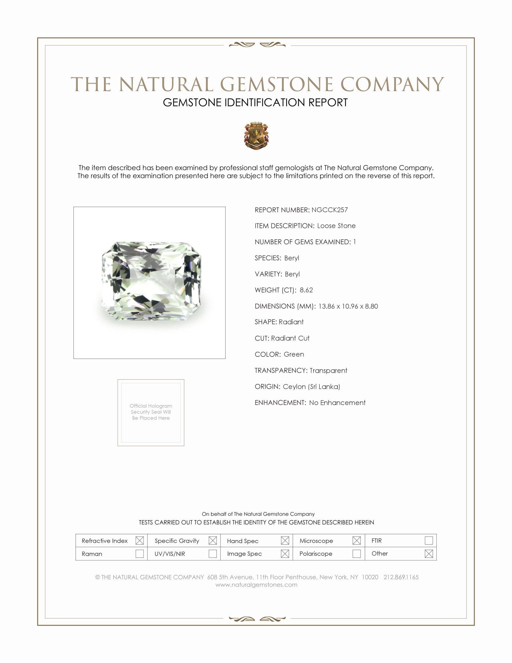 Investing in this green beryl from The Natural Gemstone Company offers more than just an addition to a collection; it is an acquisition of an asset that combines beauty, rarity, and historical significance. The exquisite craftsmanship evident in the gemstone's excellent polish ensures that it remains a touchstone of refined elegance and sophistication. Such a gem not only stands out as a conversation piece in personal collections but also serves as a wise investment in fine gemstones. With its exceptional quality and undeniable allure, our 8.62 carat radiant cut green beryl is bound to be a cherished possession that continues to delight and inspire generations to come. Trust The Natural Gemstone Company for your fine gem acquisitions and let this exemplary beryl become a radiant highlight in your collection.
