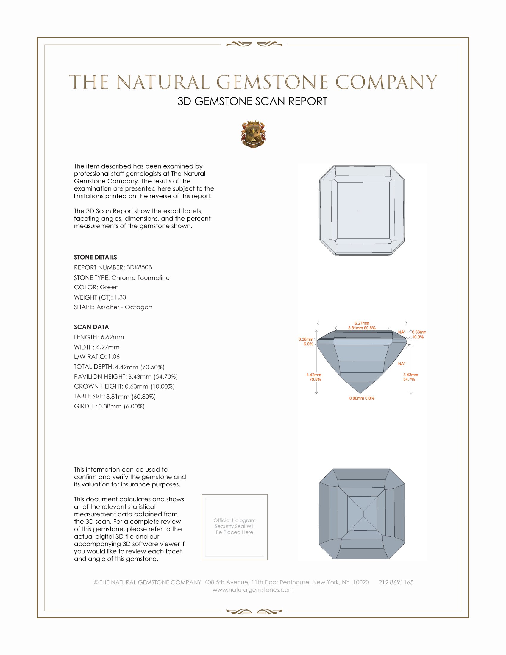 In the lush, verdant heart of Mozambique lies a hidden treasure, one that has journeyed through time and earth to capture the very essence of nature's brilliance. This exquisite green chrome tourmaline began its life deep within the mineral-rich soils of this vibrant land, where for millennia, the forces of the earth have tirelessly sculpted and refined its form. Born from the union of rich chromium deposits and pristine natural environments, our 1.33 carat asscher-octagon shaped gemstone is a testament to nature's finest collaboration. Engrained with the very hues of life's most verdant landscapes, it offers a vivid burst of green unlike any other stone.