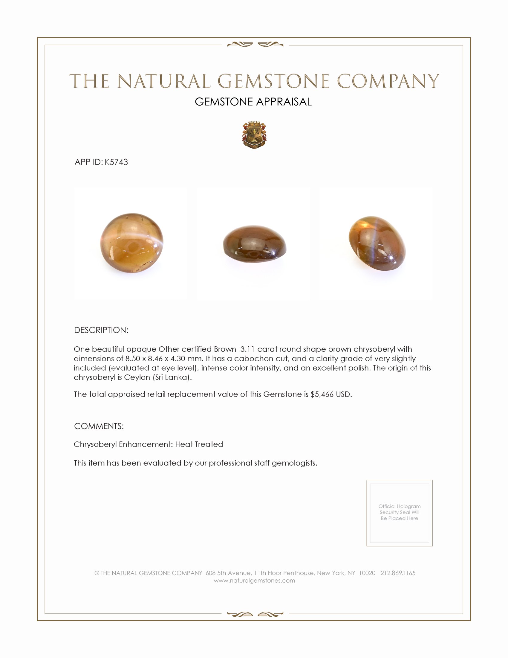 One beautiful opaque Other certified Brown 3.11 carat round shape brown chrysoberyl with dimensions of 8.50 x 8.46 x 4.30 mm. It has a cabochon cut, and a clarity grade of very slightly included (evaluated at eye level), intense color intensity, and an excellent polish. The origin of this chrysoberyl is Ceylon (Sri Lanka).