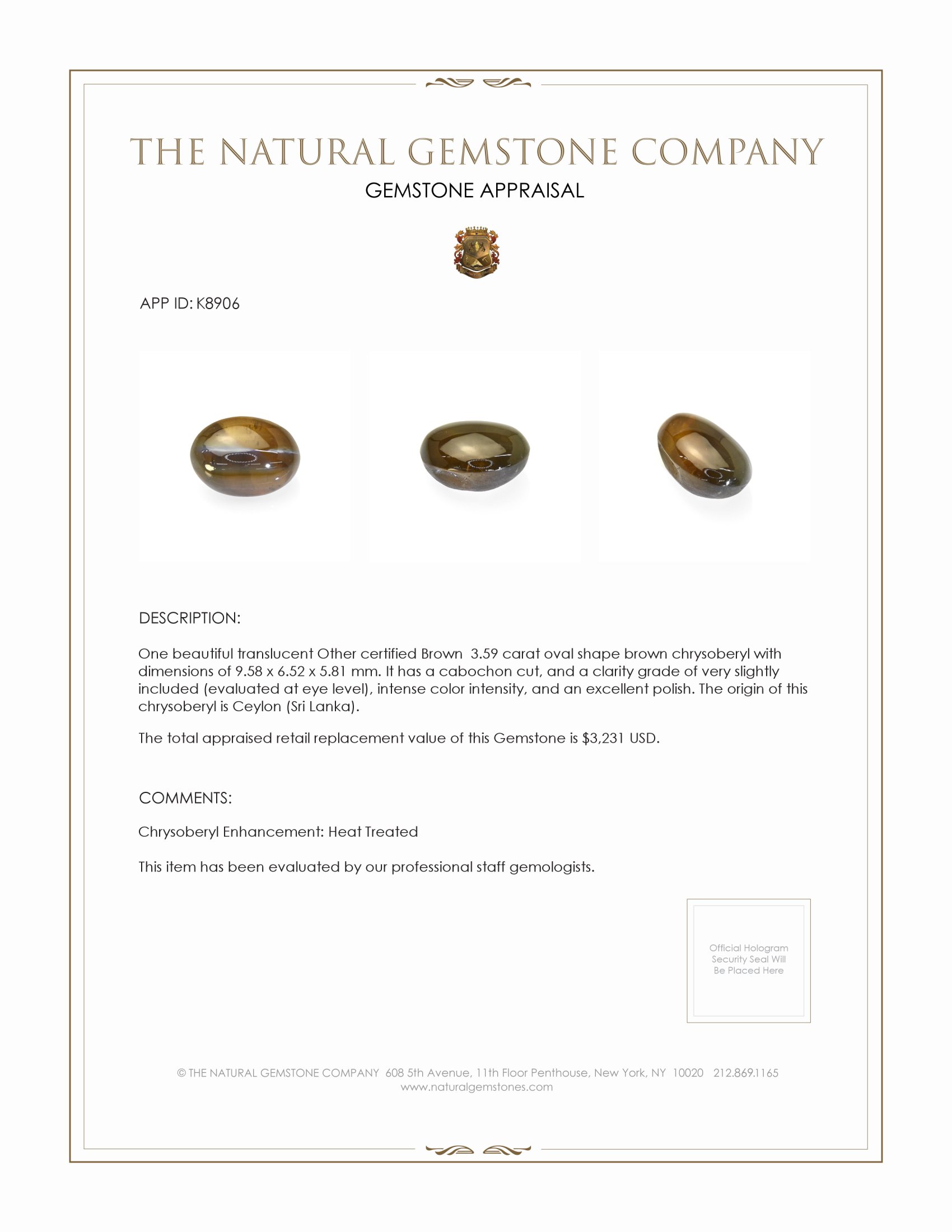 Discover a gemstone that captures the very essence of nature's miracles. Our 3.59 carat oval-shaped brown chrysoberyl is more than a jewel—it is a celebration of both elegance and emotion. This stunning gemstone, with its exceptional dimensions of 9.58 x 6.52 x 5.81 mm, hypnotizes with its warm, inviting hues that evoke the fruitful earth from which it was born. Mined in the enchanting landscapes of Ceylon, Sri Lanka, it embodies a legacy of tradition and exquisite craftsmanship. When you wear this chrysoberyl, every glance will become a love letter from the Earth, a reminder of the beauty found in life's simplest pleasures.