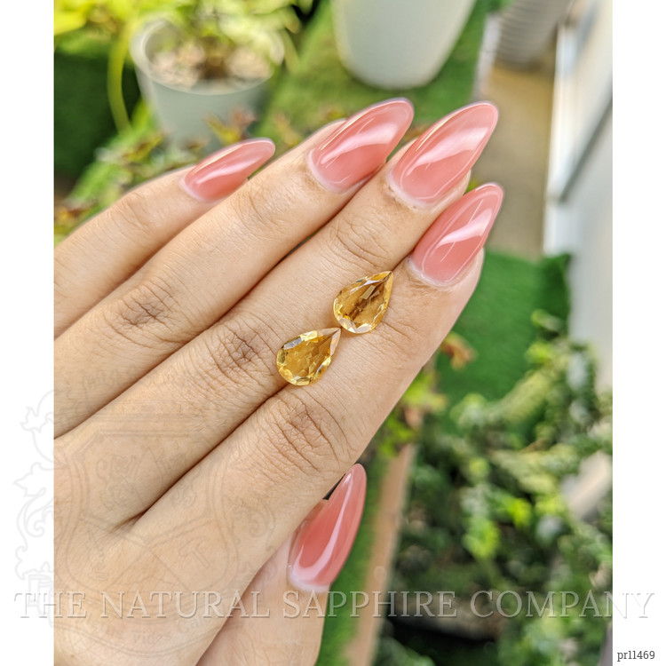 The allure of these citrines lies not only in their mesmerizing yellow glow but also in the incredible fortune of their matching splendor. With a total weight of 1.77 and 1.78 carats, their dimensions crafted into pear shapes measuring 11.67 x 7.87 x 3.59 mm and 11.74 x 7.69 x 3.99 mm, this pair epitomizes the rare art of nature’s symmetry. Imagine the rarity involved in not just finding one gem, but two, so perfectly synchronized in size and clarity, each mirroring the other’s beauty like a dance between reflection and light.
