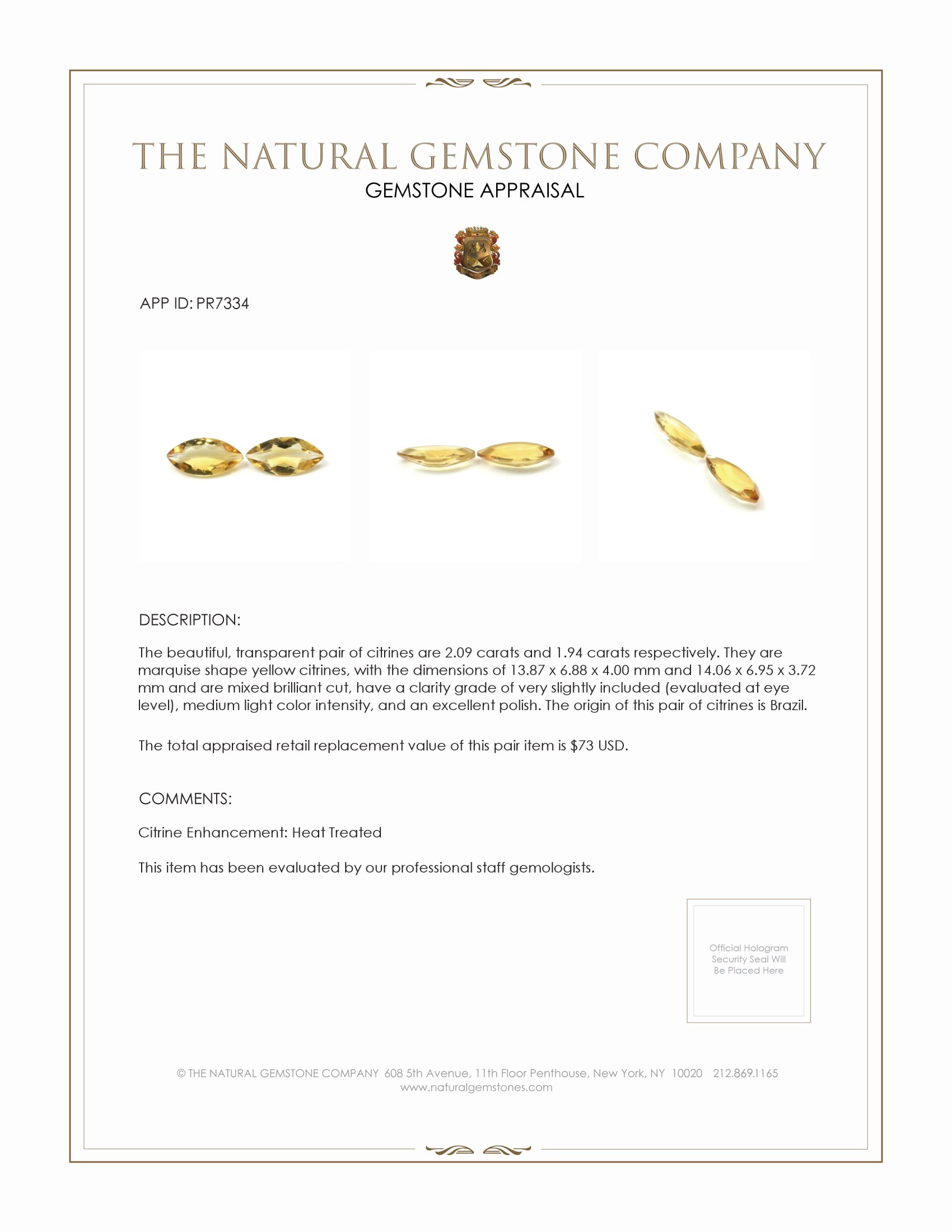 The dimensions, precisely measured at 13.87 x 6.88 x 4.00 mm and 14.06 x 6.95 x 3.72 mm, underscore the meticulous attention to detail in their creation. Both gems are cut in a mixed brilliant style, designed to maximize their light performance and amplify their medium light color intensity, radiating a warm yellow hue that is both captivating and refined.