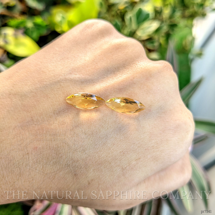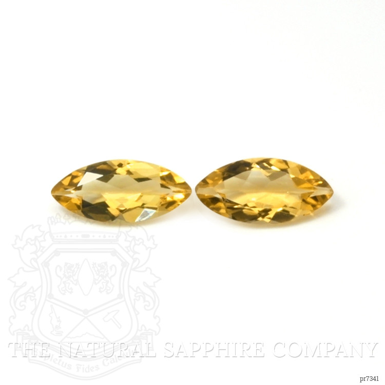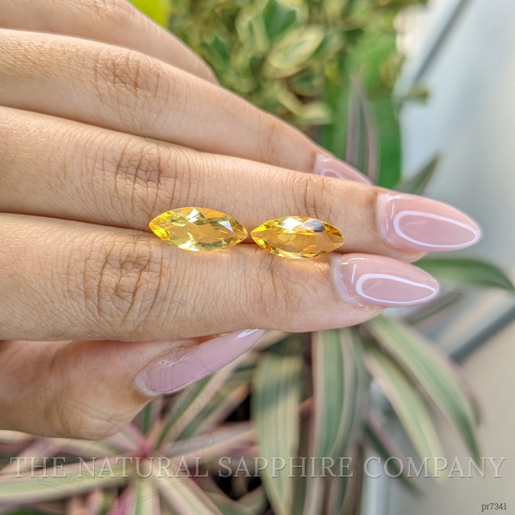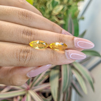 These exquisite yellow citrines are a stunning testament to nature's beauty and craftsmanship. Weighing 2.31 carats and 1.89 carats respectively, this beautiful pair exhibits a magnificent marquise shape that captures light in the most enchanting way. Each stone, with dimensions of 14.46 x 7.02 x 4.22 mm and 14.77 x 6.71 x 3.81 mm, is meticulously cut to a mixed brilliant standard. The clarity of these citrines is eye clean, evaluated at eye level, ensuring there are no visible inclusions that might mar their beauty. The medium intense color intensity brings a rich golden hue to each citrine, perfectly complementing their excellent polish, which enhances their brilliance and appeal.