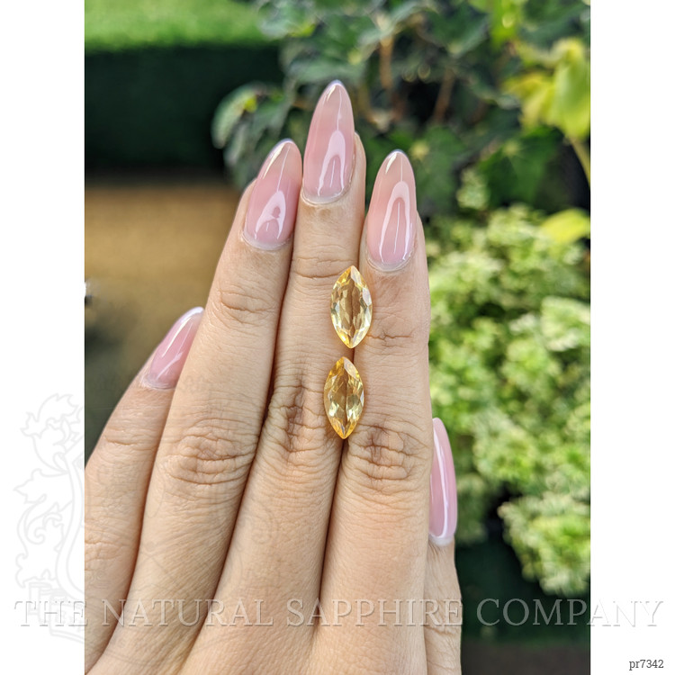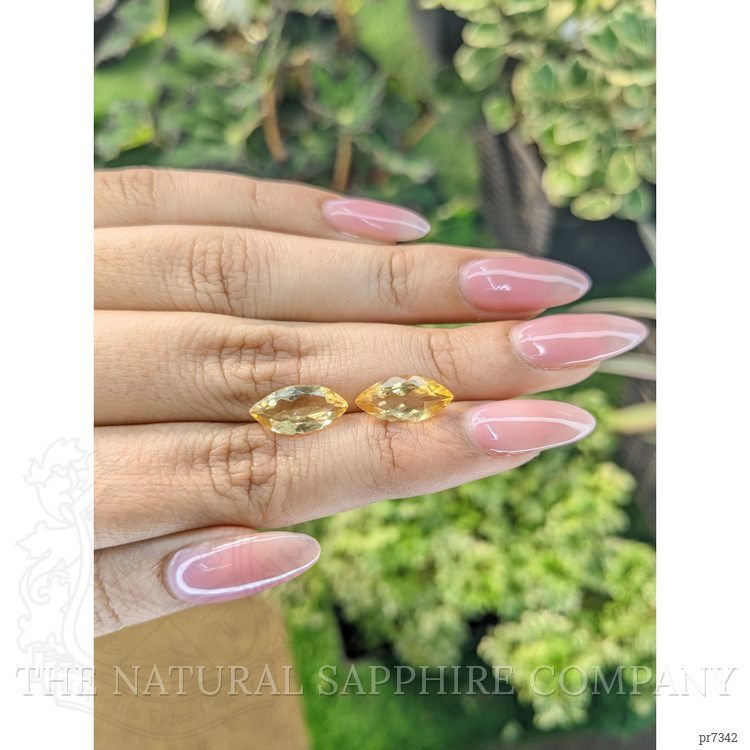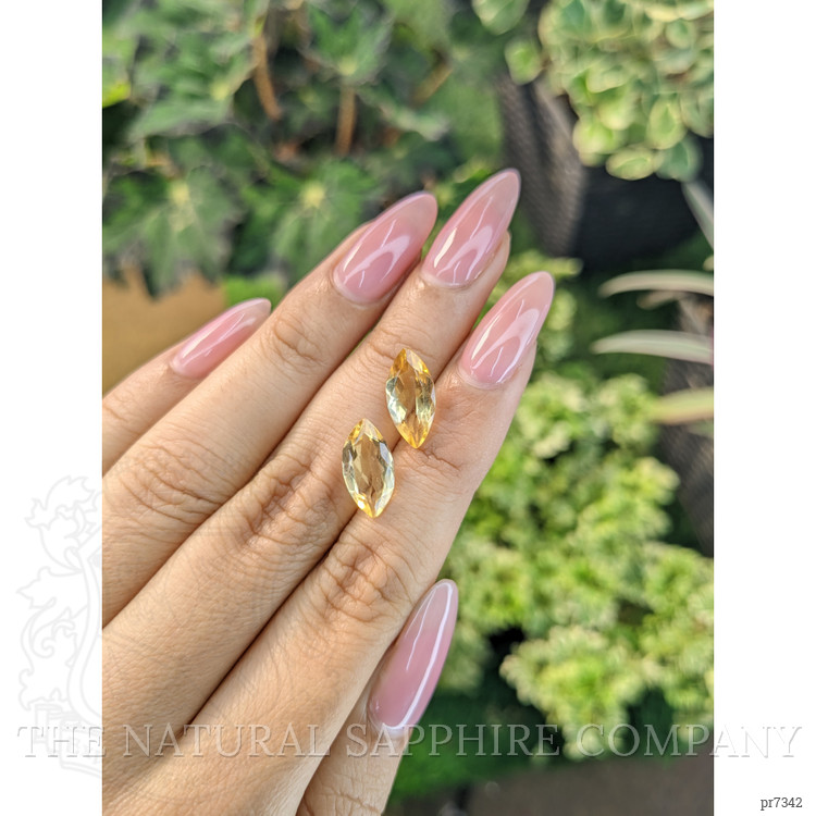 These exquisite citrines are a testament to the extraordinary beauty and craftsmanship that goes into every gemstone we offer. With an impressive weight of 2.20 carats and 2.27 carats, this pair of marquise-shaped yellow citrines is a true marvel. The stones measure 13.88 x 7.03 x 4.18 mm and 13.96 x 6.83 x 4.69 mm, delivering a noticeable impact while remaining versatile in their application.