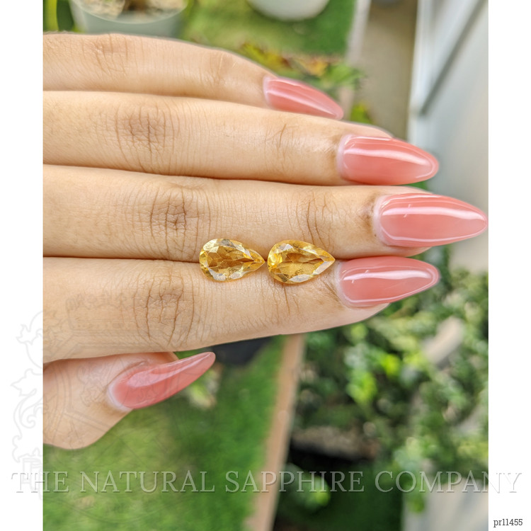 Discover the timeless allure of The Natural Gemstone Company's exquisite pair of citrines, a harmonious blend of nature's beauty and masterful craftsmanship. These pear-shaped golden treasures are sourced from Brazil, a land renowned for its rich gemstone heritage. With a combined carat weight of approximately 4.56, each citrine offers a unique narrative: one at 2.19 carats with dimensions of 11.75 x 7.61 x 4.53 mm and the other at 2.37 carats measuring 12.00 x 7.85 x 4.82 mm. Their mixed brilliant cut accentuates their transparency, allowing light to dance gracefully across their surface, creating a mesmerizing sparkle that captures the imagination.