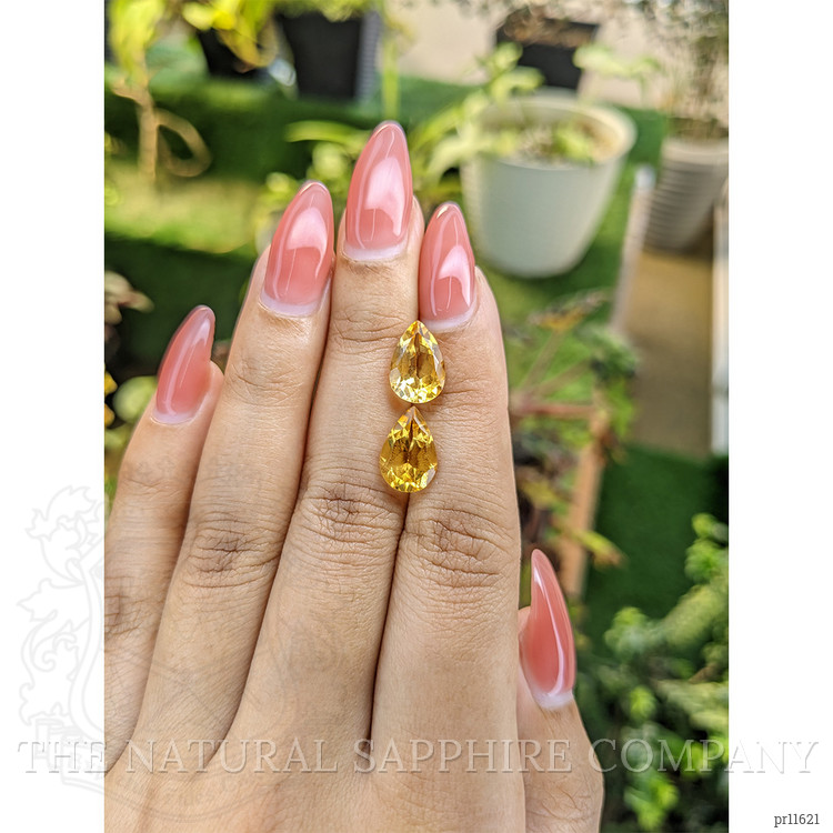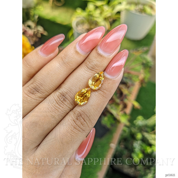 Introducing an exquisite pair of citrines, expertly curated by The Natural Gemstone Company, designed to captivate with their radiant charm and exceptional quality. These transparent pear-shaped citrines, weighing 2.36 carats and 2.77 carats respectively, distinguish themselves in the gemstone market for their unique combination of size, cut, and color. Meticulously cut into a mixed brilliant shape, each gemstone showcases dimensions of 11.72 x 7.88 x 5.22 mm and 11.72 x 7.71 x 5.78 mm, revealing a sophisticated architecture that maximizes brilliance and fire. The citrines possess a clarity grade of very very slightly included, as evaluated at eye level, ensuring a pristine surface that beautifully complements their rich hues.