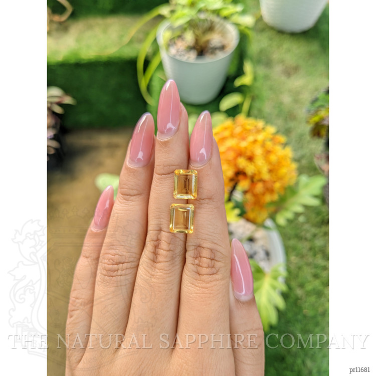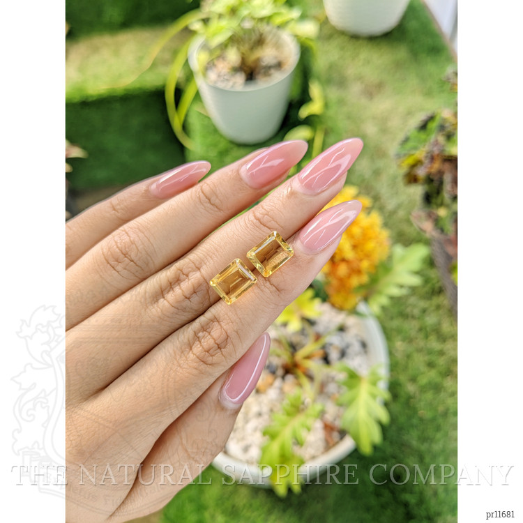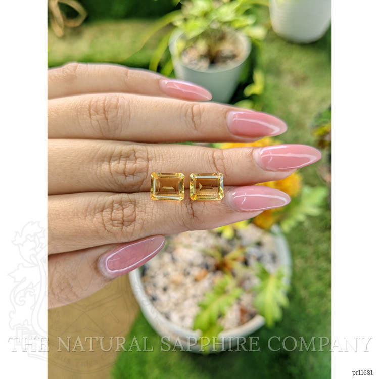 Imagine the sunshine captured in a stone. This pair of citrines, weighing in at 2.65 carats and 2.57 carats, epitomizes the essence of warmth and vitality. Their exquisite emerald cut enhances their intrinsic beauty. With dimensions that perfectly balance grace and subtlety, the stones measure 9.80 x 8.03 x 4.38 mm and 9.78 x 7.86 x 4.40 mm, respectively. The medium intense yellow color is captivating, invoking a sense of brightness and joy with each glance. Each citrine's clarity is evaluated at eye level and deemed eye clean, ensuring that every facet directs light effortlessly, resulting in a mesmerizing display.