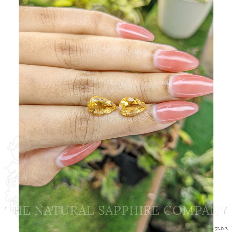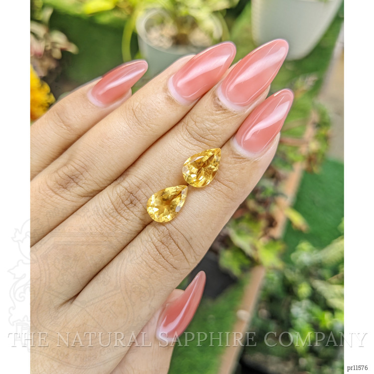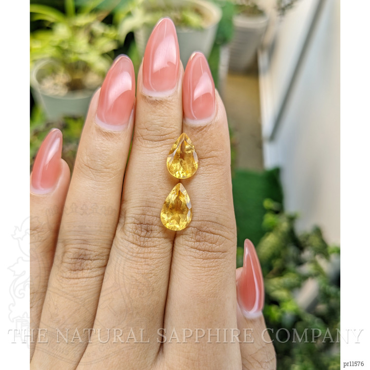 At The Natural Gemstone Company, we take pride in offering gemstones that speak for themselves in both quality and beauty. Our stunning pair of yellow citrines, weighing 3.05 and 2.78 carats respectively, are no exception. These gemstones are crafted into a classic pear shape, measuring 12.23 x 7.94 x 6.03 mm and 11.81 x 8.09 x 5.91 mm. These dimensions highlight their brilliance and allow them to catch light with every movement. The mixed brilliant cut ensures maximum sparkle, enhancing their allure whether they're seen up close or from afar.