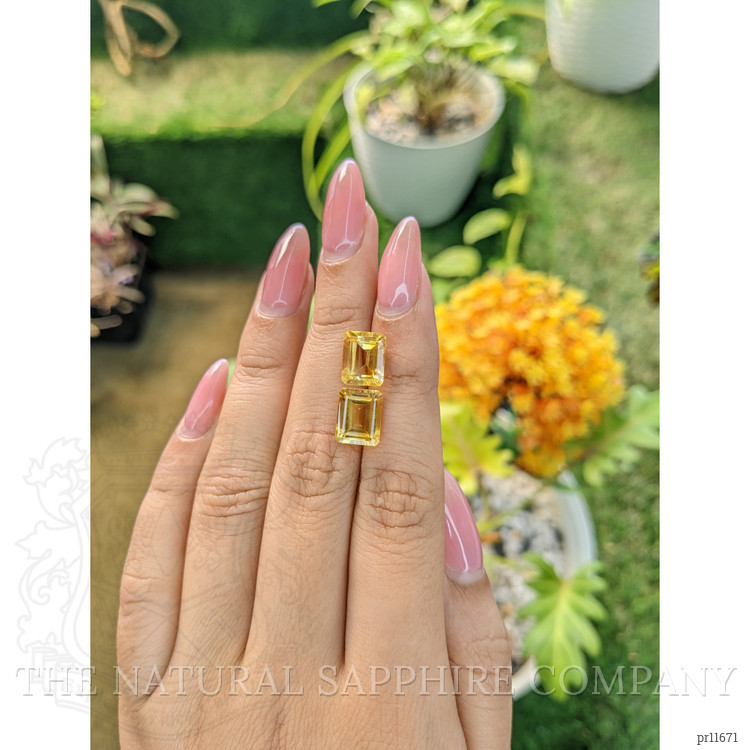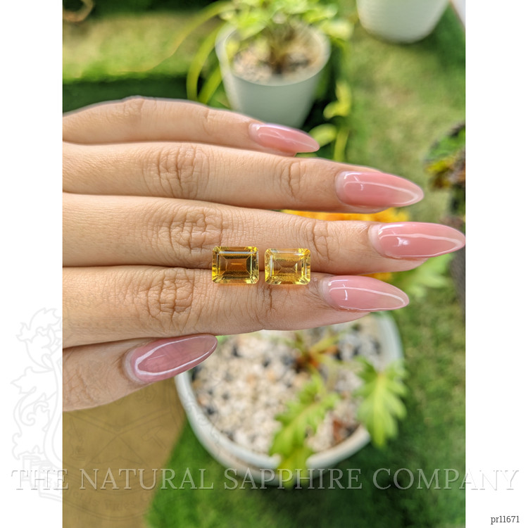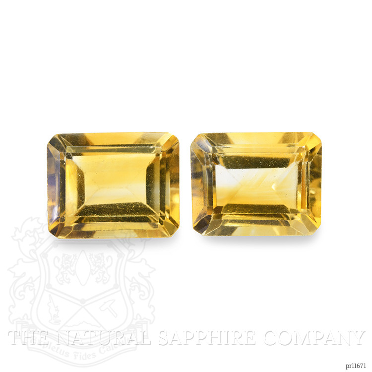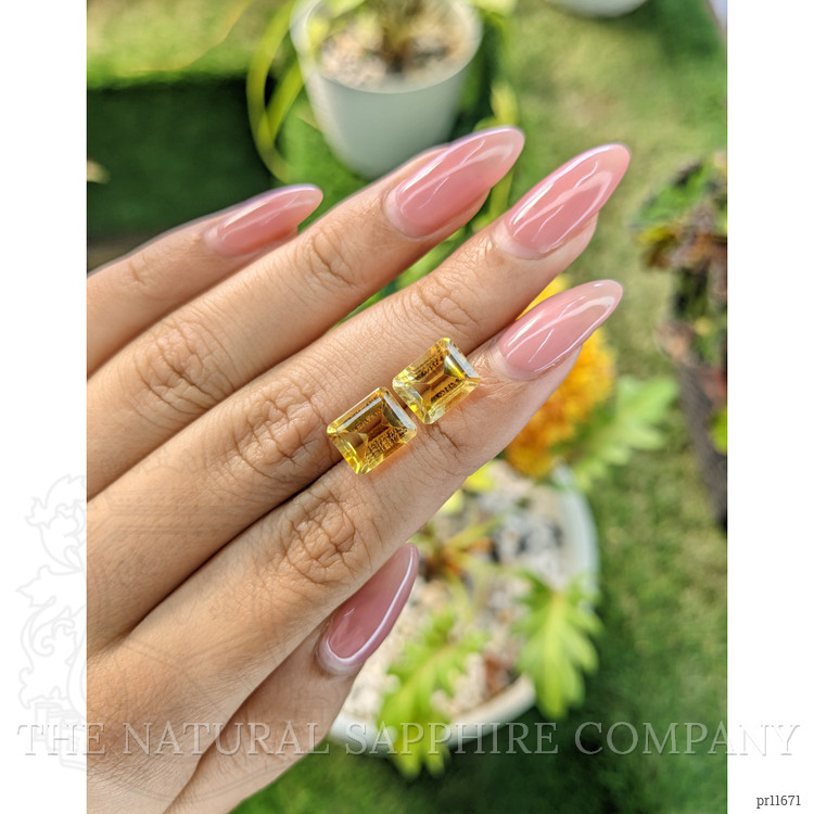 At The Natural Gemstone Company, we proudly present this exquisite matched pair of citrines, a testament to the beauty and craftsmanship inherent in the world of fine gemstones. When comparing these to alternatives in the market, our citrines stand out for their exceptional clarity and vibrant color. Each citrine weighs 3.03 and 3.07 carats respectively, featuring an emerald-cut shape that captivates with its precise dimensions of 9.84 x 7.86 x 5.38 mm and 9.76 x 7.64 x 5.73 mm. The alluring yellow hues and medium color intensity create a visual splendor unmatched by many other stones available. Heat-treated to enhance their natural brilliance, these eye-clean citrines gleam with an excellent polish, encapsulating nature and refinement in one harmonious pair.