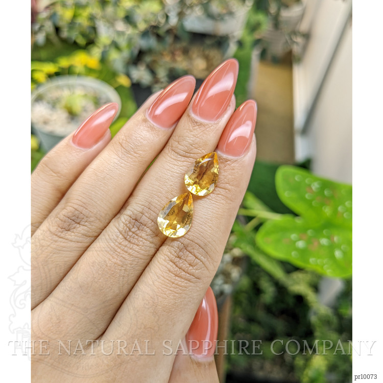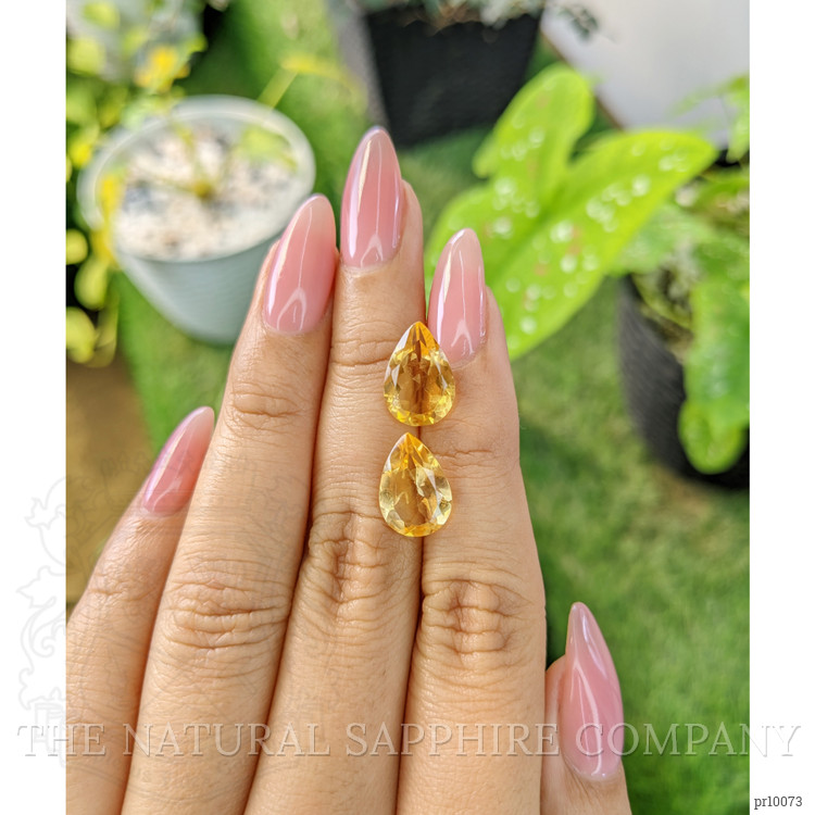At The Natural Gemstone Company, we bring to you a stunning duo of citrines that exemplifies the finest in gemstone quality and craftsmanship. Originating from Brazil, a country renowned for producing some of the world's most exquisite gemstones, these pear-shaped citrines are a testament to nature's artistry. The stones feature weights of 3.20 carats and 3.14 carats respectively, combined with dimensions of 13.21 x 9.06 x 5.36 mm and 13.03 x 8.91 x 5.10 mm. This pair captivates the eye with its vibrant, medium intense yellow hue, delivering a brilliance rarely matched in the world of gemstones.