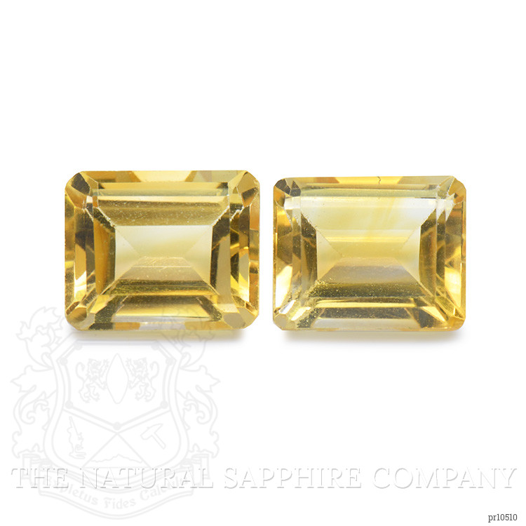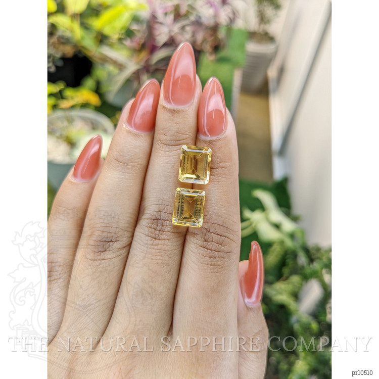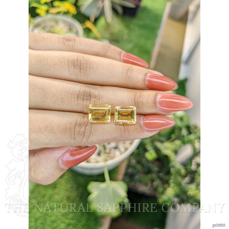 Indulge in the unparalleled elegance of our exquisite pair of citrines, presented to you by The Natural Gemstone Company. These captivating gemstones, each weighing 4.38 and 4.40 carats, embody the timeless allure and sophisticated charm that make them an essential addition to any discerning collector's array. Crafted meticulously with an emerald cut shape, their dimensions are adorned with precision at 10.93 x 9.01 x 6.30 mm and 10.81 x 8.78 x 6.13 mm, allowing each facet to dance gracefully with light, captivating all who gaze upon them. Their clarity has been graded as eye clean, ensuring each glance through their bewitching transparency is unblemished by the slightest imperfection.