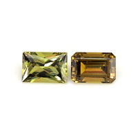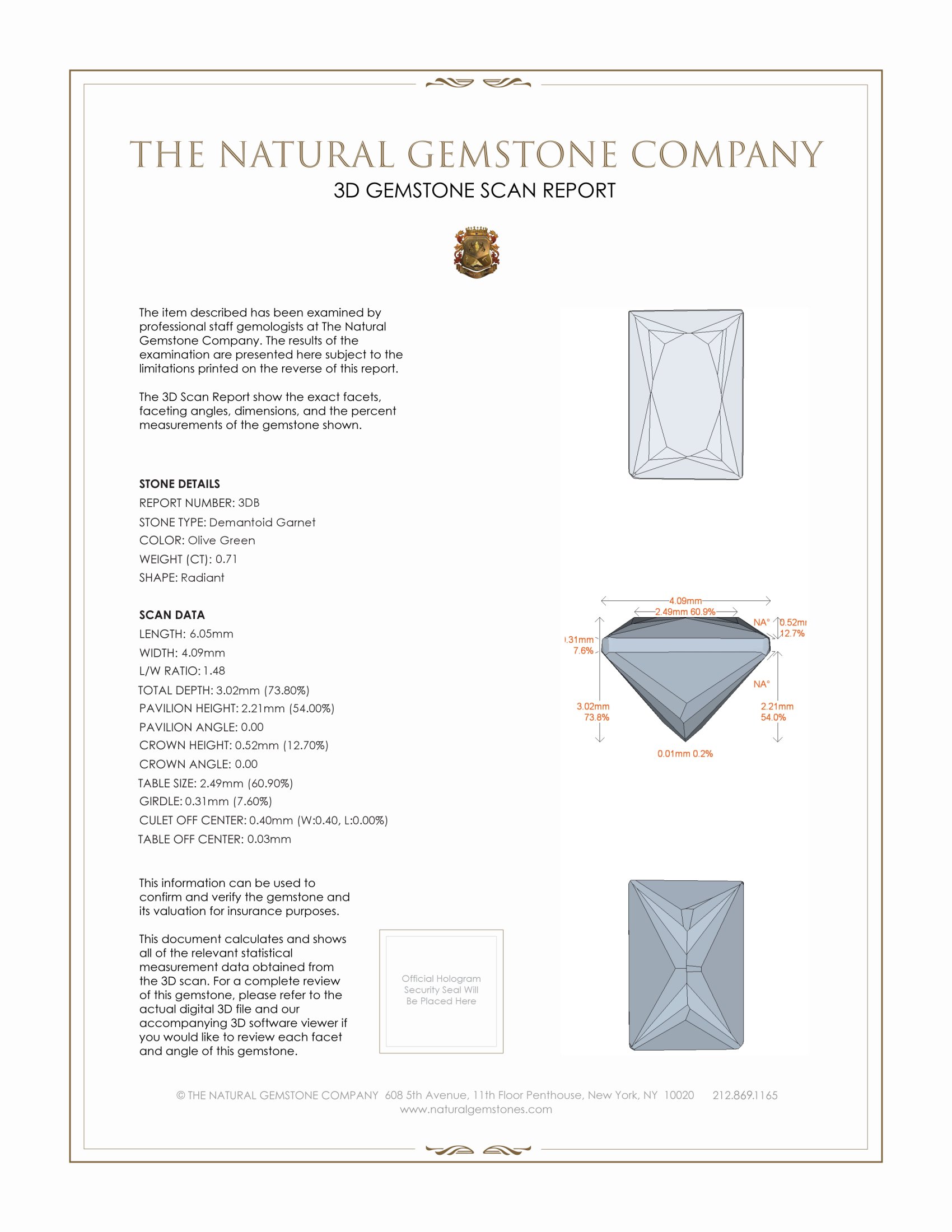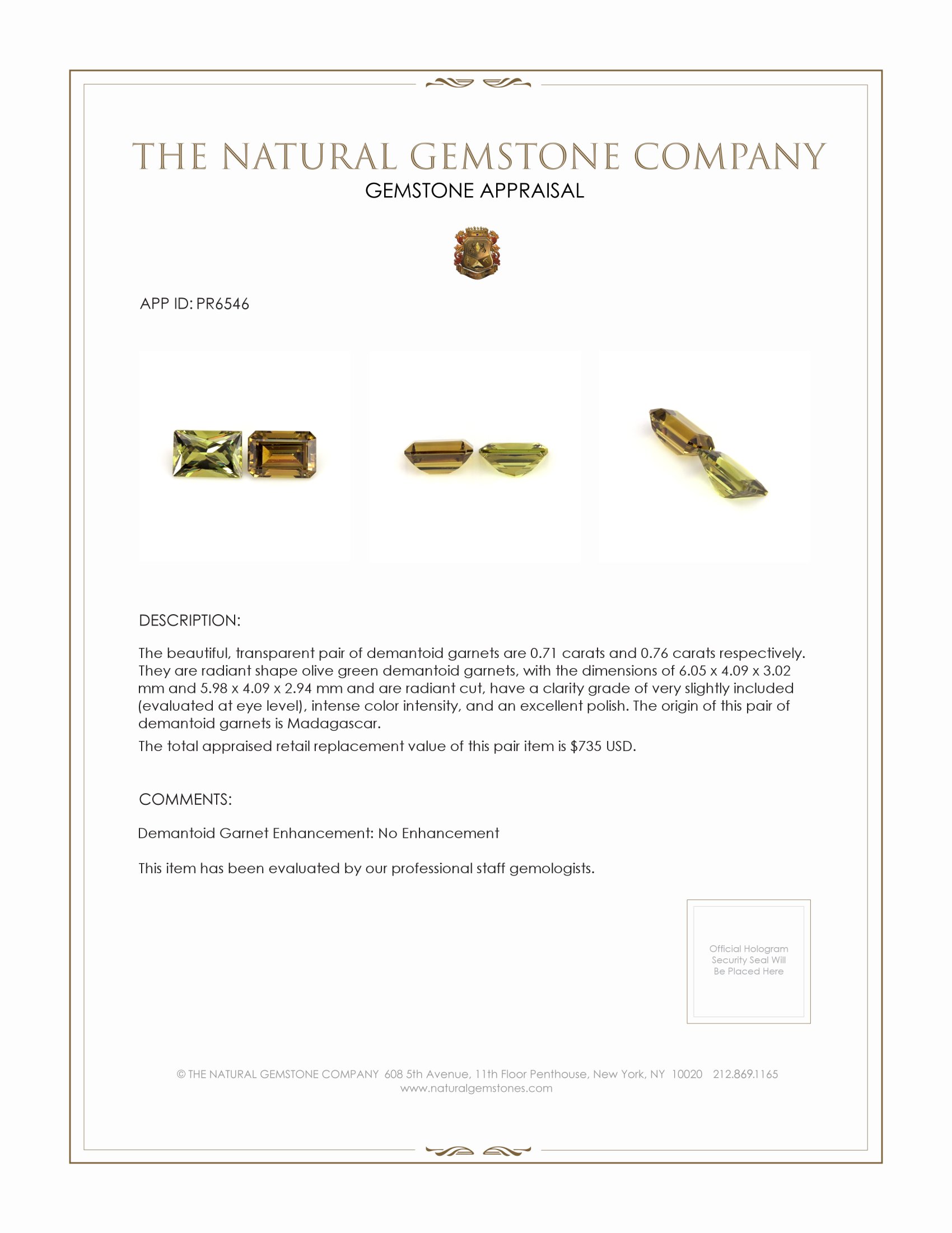 The specific pair of demantoid garnets described here are of exceptional quality and size. Weighing 0.71 and 0.76 carats with dimensions of 6.05 x 4.09 x 3.02 mm and 5.98 x 4.09 x 2.94 mm, they fall into a desirable size category that showcases their color and clarity while remaining versatile for different types of jewelry. Their radiant cut, a hybrid cut style that combines the shapes of a rectangle and the faceting pattern of a round brilliant cut, maximizes their brilliance and depth of color. A clarity grade of 'very slightly included' suggests that any inclusions are minimal and difficult to perceive with the naked eye, ensuring that the gemstones retain their transparent, eye-catching appearance. The excellent polish on these garnets ensures that the stones interact with light beautifully, enhancing their overall sparkle and appeal.