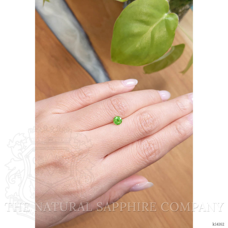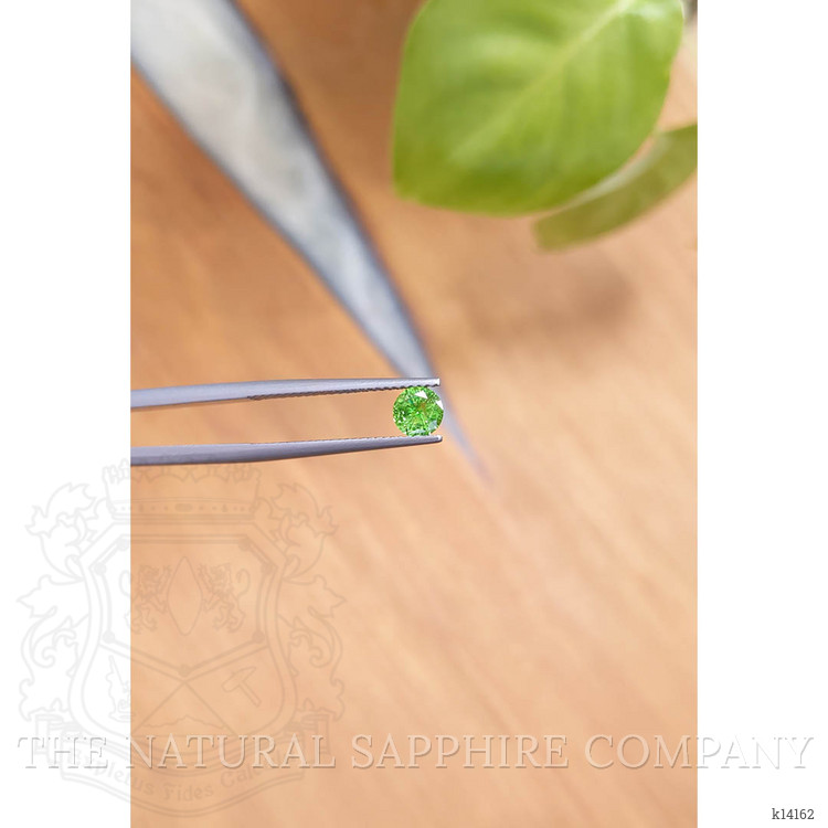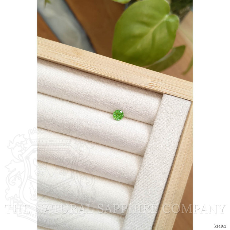 At The Natural Gemstone Company, we are proud to present a magnificent 0.57 carat natural green demantoid garnet, expertly sourced from the rich mineral deposits of Madagascar. This exquisite gemstone is a testament to the unrivaled beauty and complexity that Mother Nature herself bestows upon her creations. With precise dimensions of 5.13 x 5.11 x 3.10 mm, it captures attention with its round shape and mixed brilliant cut, designed to maximize the refraction of light and enhance the stone’s natural luster. The intense color intensity is not only captivating but speaks volumes of the garnet's organic purity, untouched by artificial enhancements.