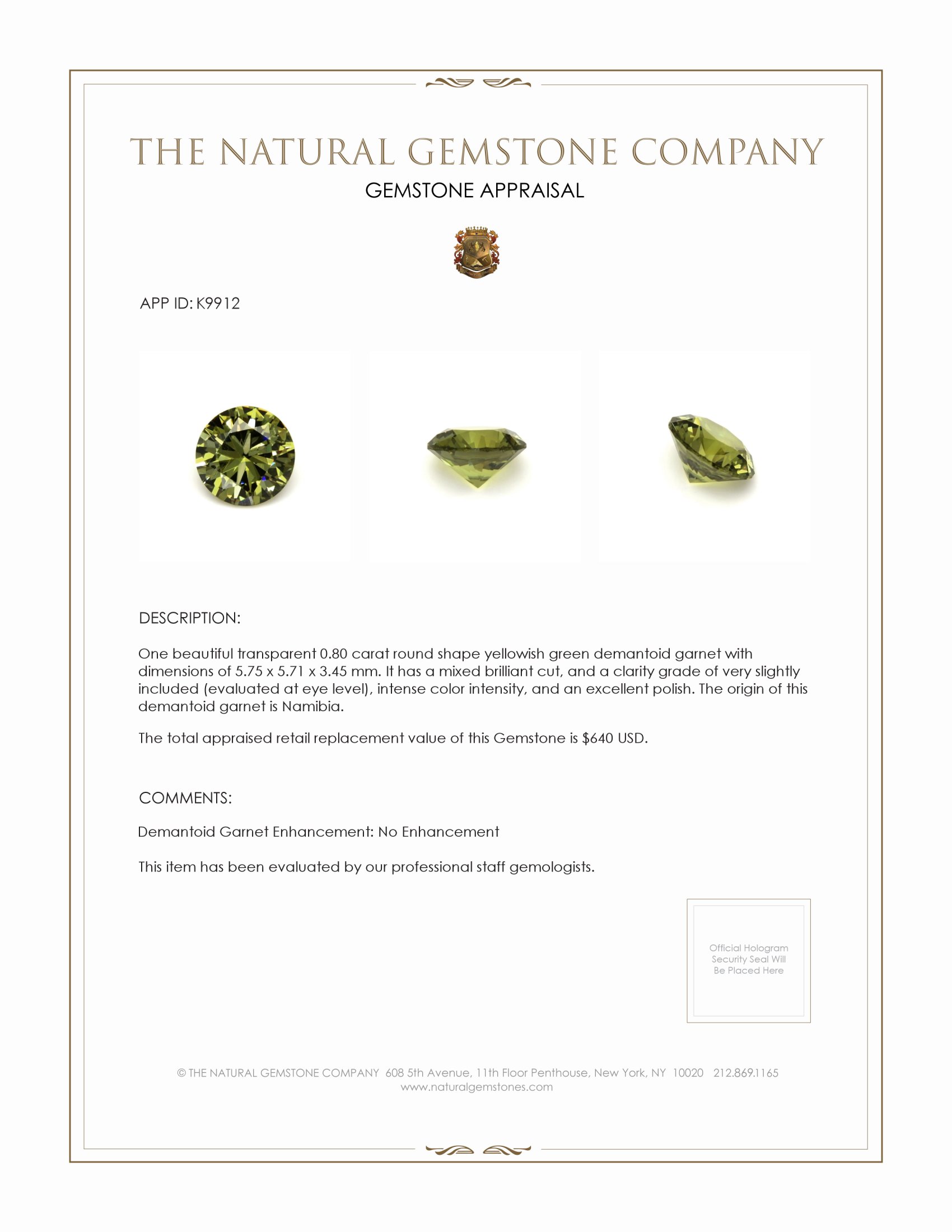 For those who cherish the legacy of gemstones and their timeless elegance, the yellowish green demantoid garnet from The Natural Gemstone Company offers a captivating glimpse into the wonders of the natural world. This exquisite gem, originating from the rich lands of Namibia, embodies a history that spans back not only through the depths of the earth but also across centuries of human fascination with beauty in its purest form. With its 0.80 carat round shape and dimensions measuring 5.75 x 5.71 x 3.45 mm, this garnet presents a rare opportunity to own a piece of heritage imbued with exceptional artistry. Its mixed brilliant cut allows light to cascade across its surface, revealing the intense color intensity that renders this gem as vibrant as it is refined.
