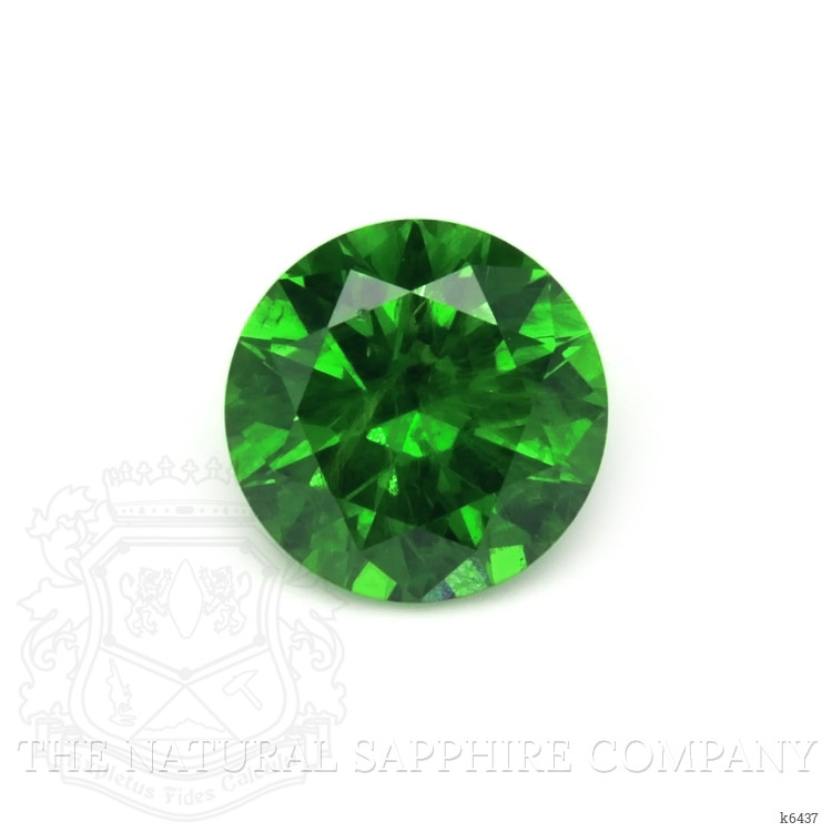 The highlighted gemstone is a stunning transparent green demantoid garnet, carefully sourced from the rich deposits of Russia. Weighing 0.81 carats, this exquisite gemstone is sculpted into a round shape, exhibiting dimensions of 5.69 x 5.68 x 3.60 mm. Its precision and innate beauty are further enhanced by a mixed brilliant cut, designed to maximize the reflective qualities of the stone, ensuring that it emits a captivating sparkle. This focus on brilliance is complemented by the gem's vivid color intensity, which immerses the observer in a rich green hue, synonymous with both elegance and versatility.