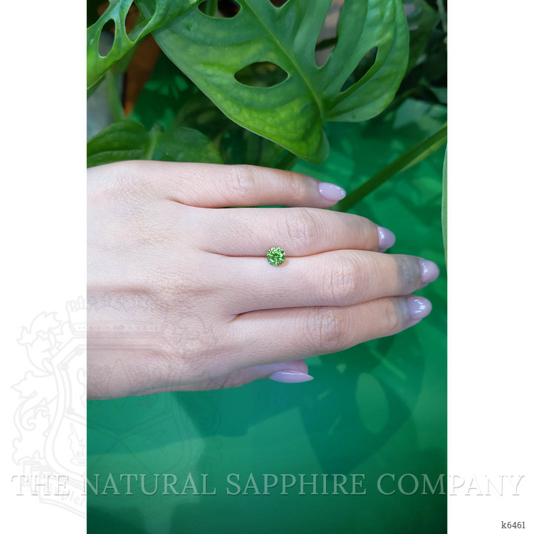 This particular demantoid garnet, cut into a precise round shape with dimensions of 5.54 x 5.54 x 3.68 mm, showcases a masterful mixed brilliant cut. This type of faceting enhances the stone’s inherent brilliance by combining step-cut facets on the pavilion with brilliant-cut facets on the crown. Such a technique is meticulously designed to maximize light reflection, which results in an impressive display of fire and brilliance. The excellent polish further accentuates its luster, ensuring that every facet is sharp and vivid, contributing to an unparalleled visual experience.