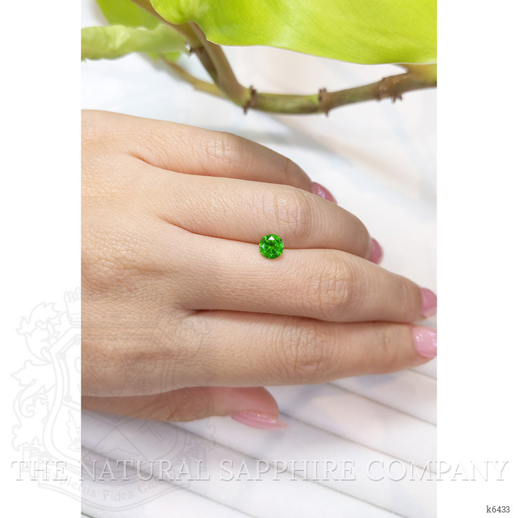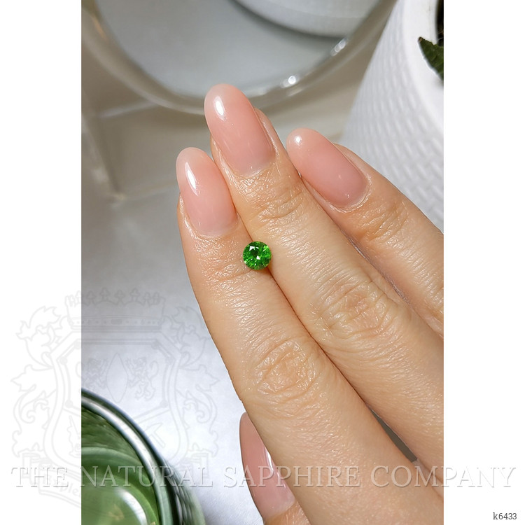 In a world where the heart seeks moments that shimmer with dream-like grace, behold the ethereal splendor of our treasured possession: a transparent green demantoid garnet. This gemstone, round and resplendent, weighs a delicate 0.87 carats, yet holds the universe of your devotion within its petite dimensions of 5.63 x 5.60 x 3.71 millimeters. Let it be known that it’s not just a gem you hold but a fragment of enchanting whispers from the heart of Russia, a land where legends of love are woven alongside the tapestry of time.