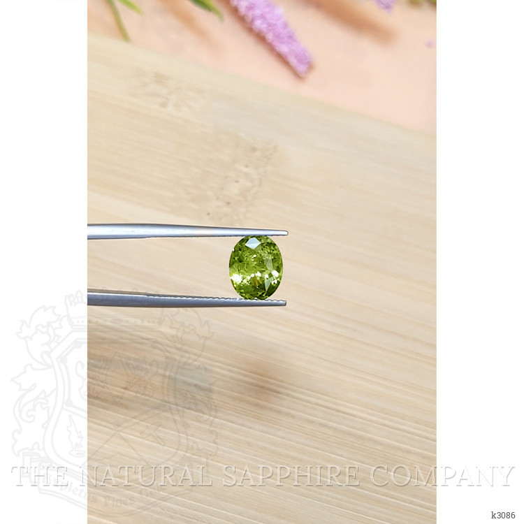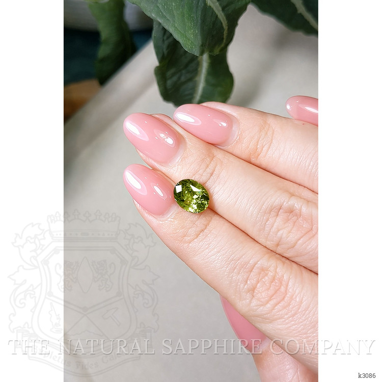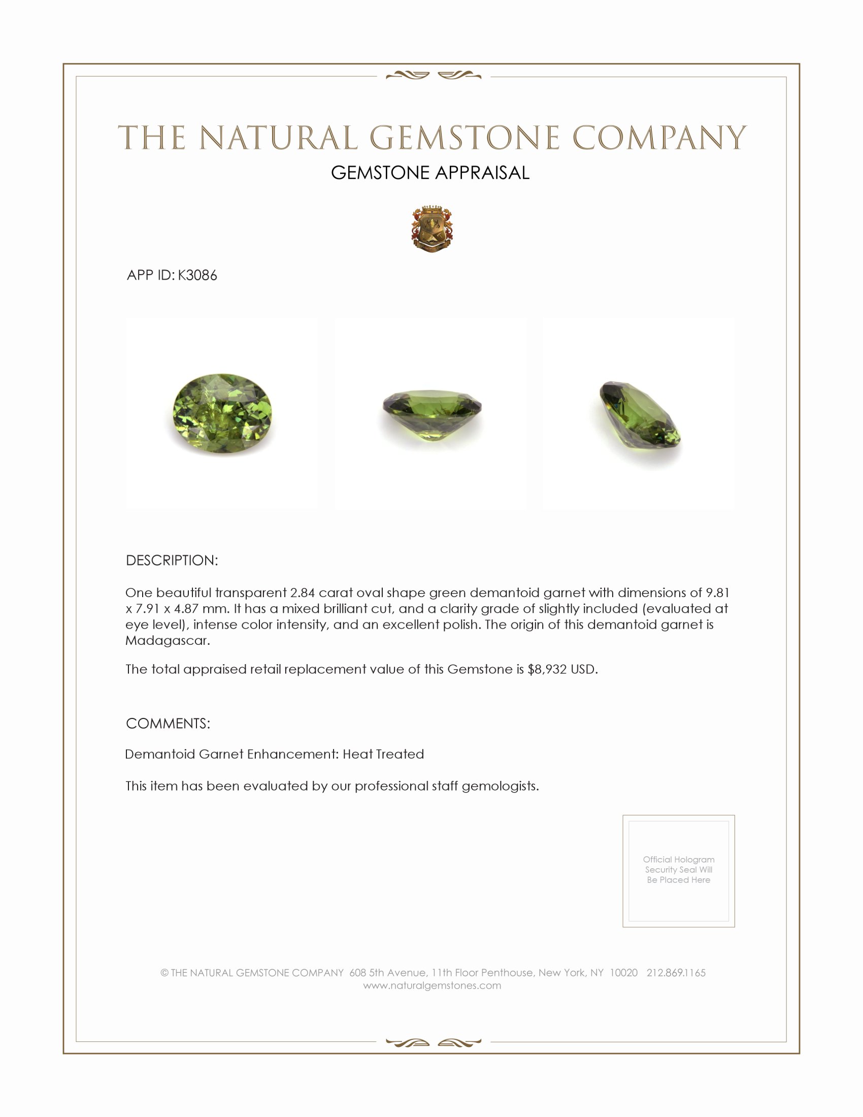Beneath the surface of Madagascar, natural forces converged millions of years ago to give rise to a gemstone of extraordinary beauty. Our 2.84 carat oval shape green demantoid garnet is a testament to the wonder of geological processes and a marvel of enduring splendor. Intense pressures and high temperatures deep within the Earth's mantle fostered an environment conducive to the growth of this mineral. Over vast periods, this unique garnet crystallized into its characteristic green hue, influenced by minute traces of chromium and iron that impart its intense color intensity.