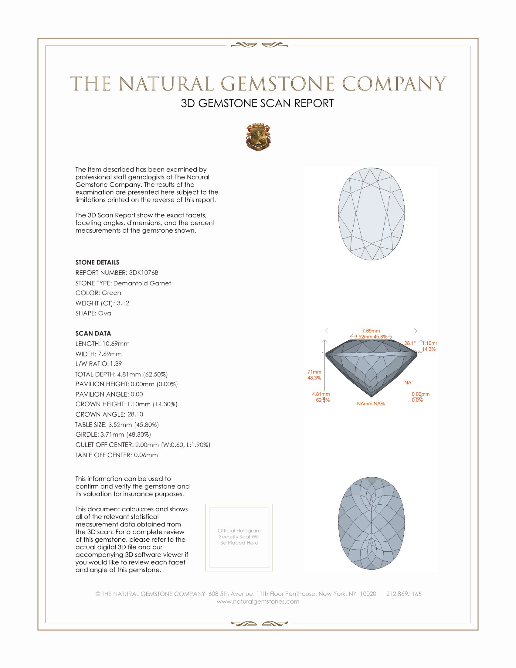 Discover the epitome of rarity and elegance with our exquisite 3.12 carat oval shape green demantoid garnet, exclusively from The Natural Gemstone Company. This magnificent gemstone, hailing from the exotic landscapes of Madagascar, is a testament to nature's unparalleled artistry. Its dimensions of 10.69 x 7.69 x 4.81 mm perfectly encapsulate its transparent brilliance and size, making it a standout piece in any collection or jewelry creation.