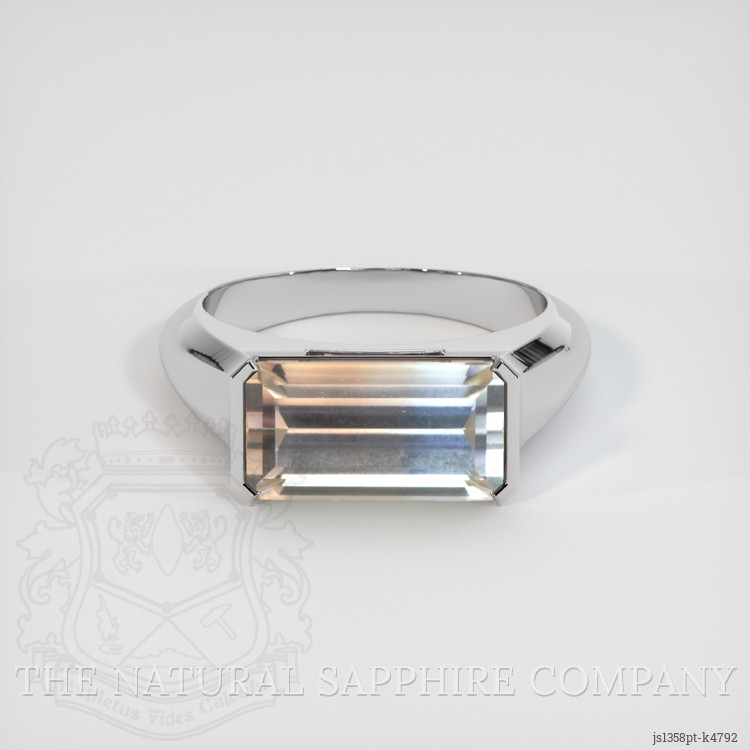 The men's ring features a beautiful, transparent 5.90 carat emerald cut shape bi color topaz with the dimensions of 13.12 x 6.75 x 6.28 mm and a emerald cut. It has a clarity grade of very slightly included (evaluated at eye level), very light color saturation, and an excellent polish. The origin of this topaz is Ukraine .