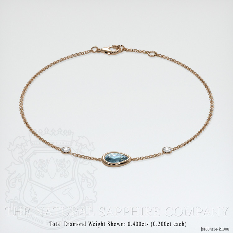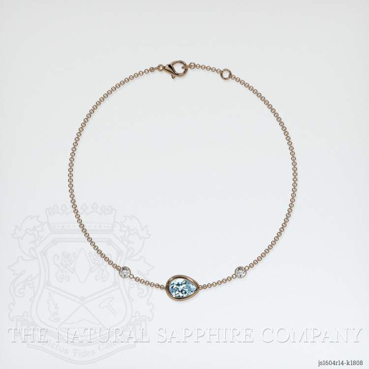 The bracelet features a beautiful, transparent 0.80 carat pear shape sky blue aquamarine with the dimensions of 7.54 x 5.25 x 3.93 mm and a mixed brilliant cut. It has a clarity grade of very slightly included (evaluated at eye level), very light color saturation, and an excellent polish. The origin of this aquamarine is Mozambique.