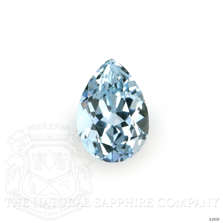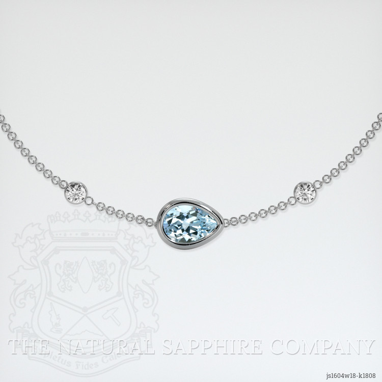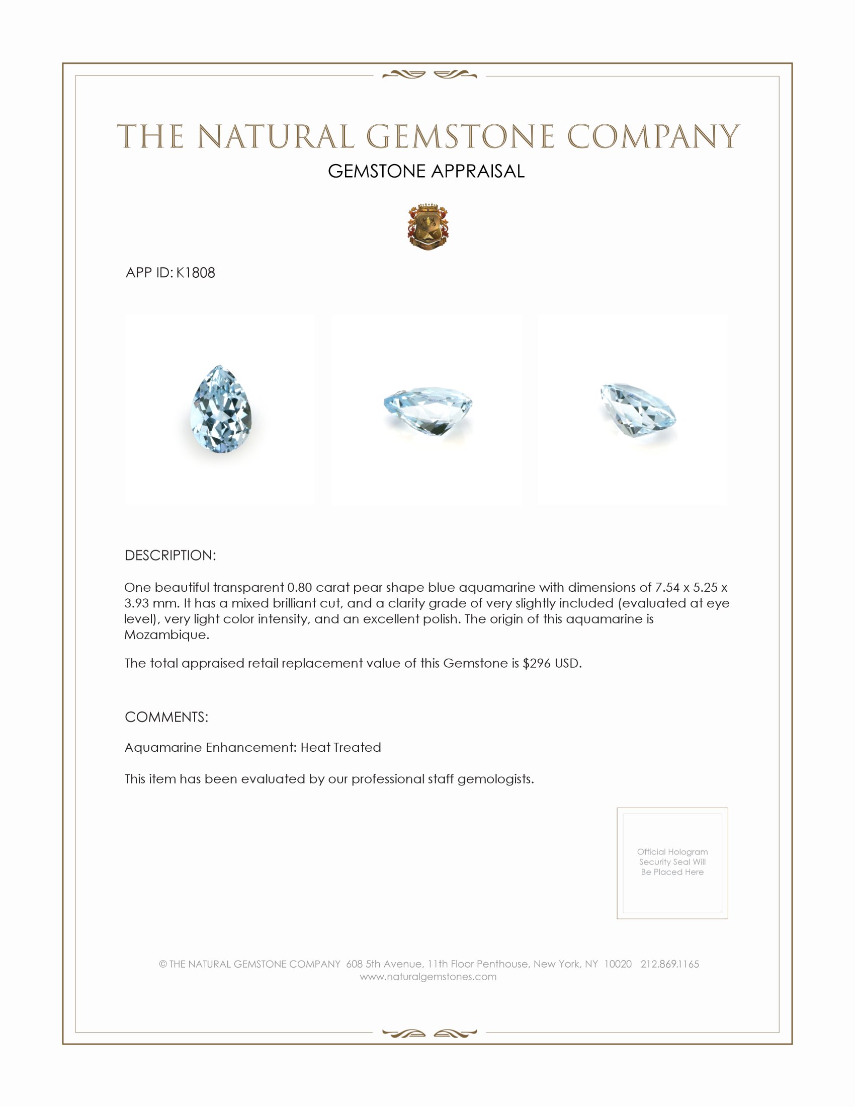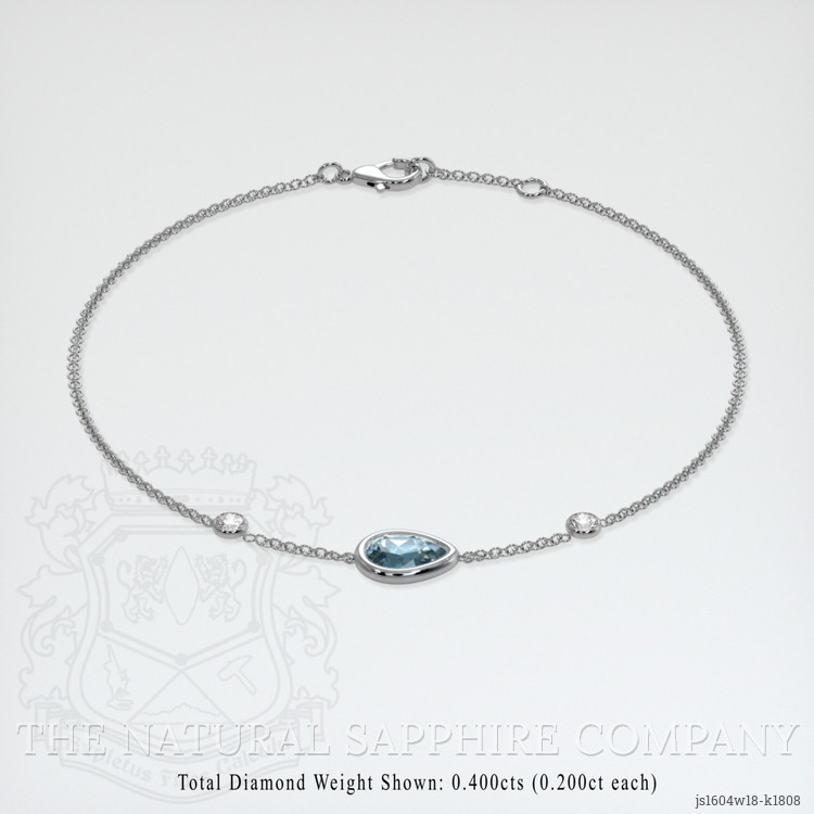 The bracelet features a beautiful, transparent 0.80 carat pear shape sky blue aquamarine with the dimensions of 7.54 x 5.25 x 3.93 mm and a mixed brilliant cut. It has a clarity grade of very slightly included (evaluated at eye level), very light color saturation, and an excellent polish. The origin of this aquamarine is Mozambique.