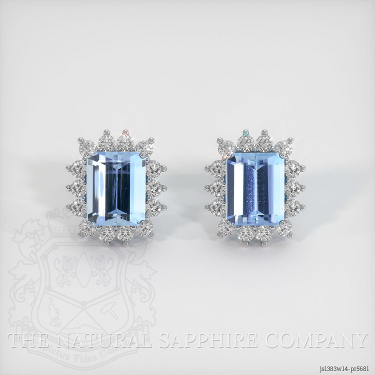 The earrings feature a beautiful, transparent pair of aquamarines that are 5.98 total carat weight. They are emerald cut shape sky blue aquamarines, with the dimensions of 9.83 x 7.64 x 5.78 mm and are emerald cut, have a clarity grade of very slightly included (evaluated at eye level), medium color saturation, and an excellent polish. The origin of this pair of aquamarines is Nigeria.